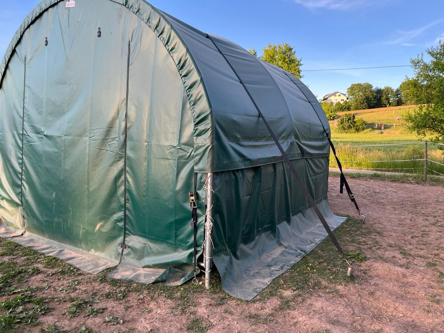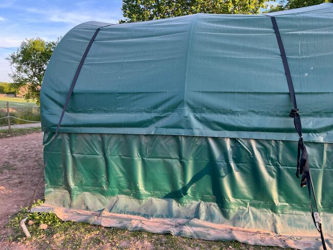 Namiot pastwiskowy 4x4m - Oferta jak nowy namiot pastwiskowy od Toolporth, Namiot pastwiskowy 4x4m, plandeka PVC, ciemnozielony, mocowanie do ziemi Profesjonalny Stabilne i odporne na warunki atmosferyczne schronienie do odpoczynku i karmienia Trwała okrągła konstrukcja łukowa Łatwy montaż dzięki praktycznemu systemowi wtykowo-śrubowemu Bardzo odporna na rozdarcia i wodoodporna plandeka PVC 2300 N (NP 1699€)