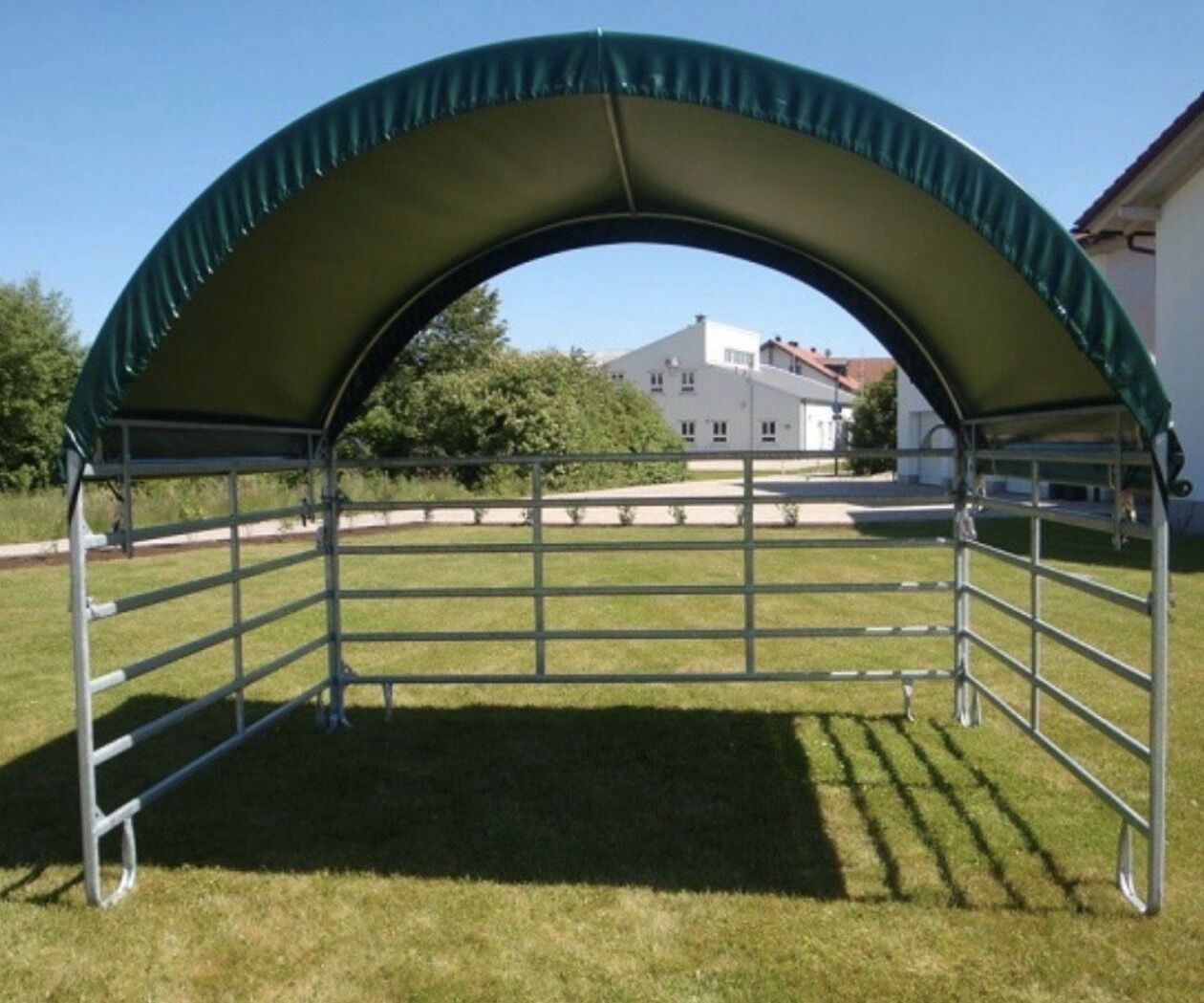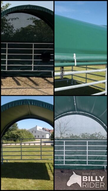 Solidna metalowa rama zapewnia wysoką stabilność, a wytrzymała, odporna na warunki atmosferyczne plandeka zapewnia niezawodną ochronę przed słońcem, deszczem i wiatrem. Idealny na pastwisko, wybieg lub padok.