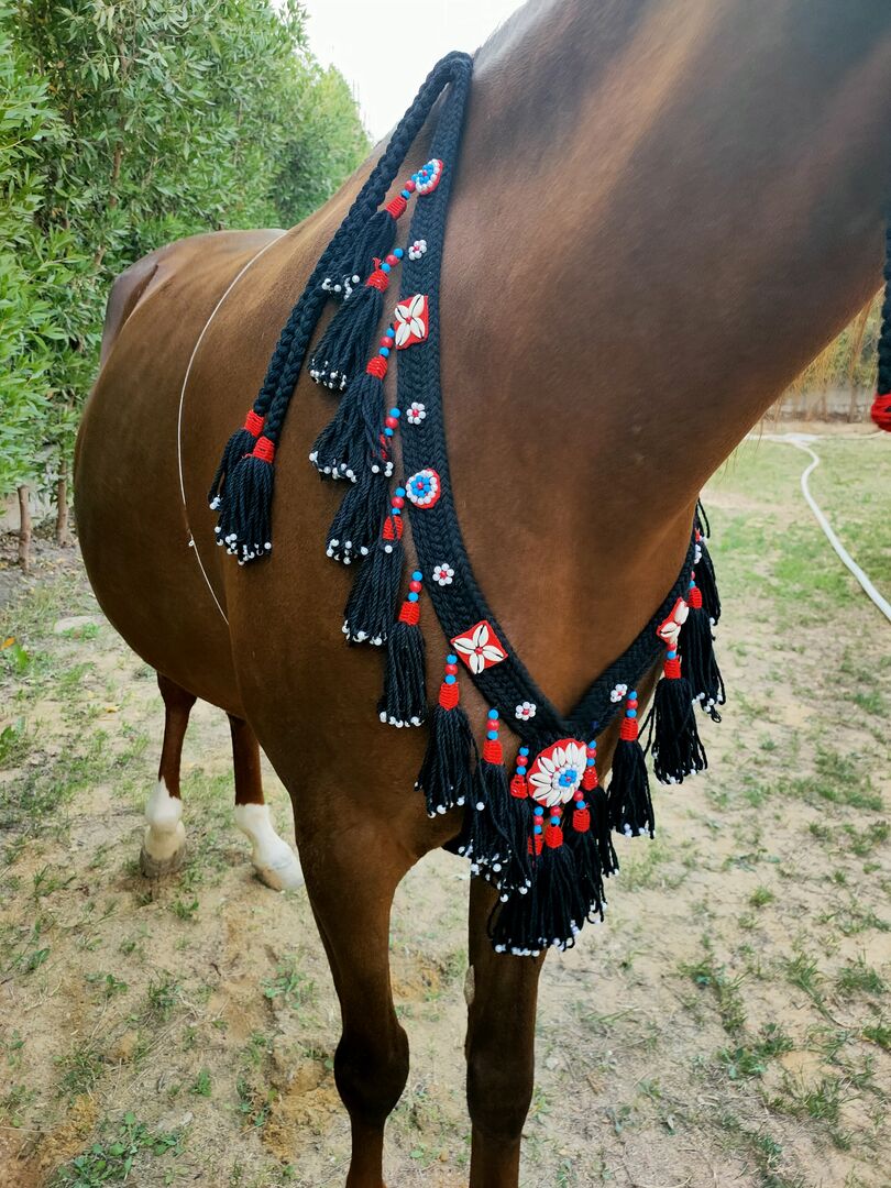 Napierśnik posiada pętlę na popręg i jest misternie zdobiony muszlami i ornamentami. Materiał jest przyjemnie miękki, myślę, że to wełna. Napierśnik jest wykonany ręcznie i dlatego jest wyjątkowy.