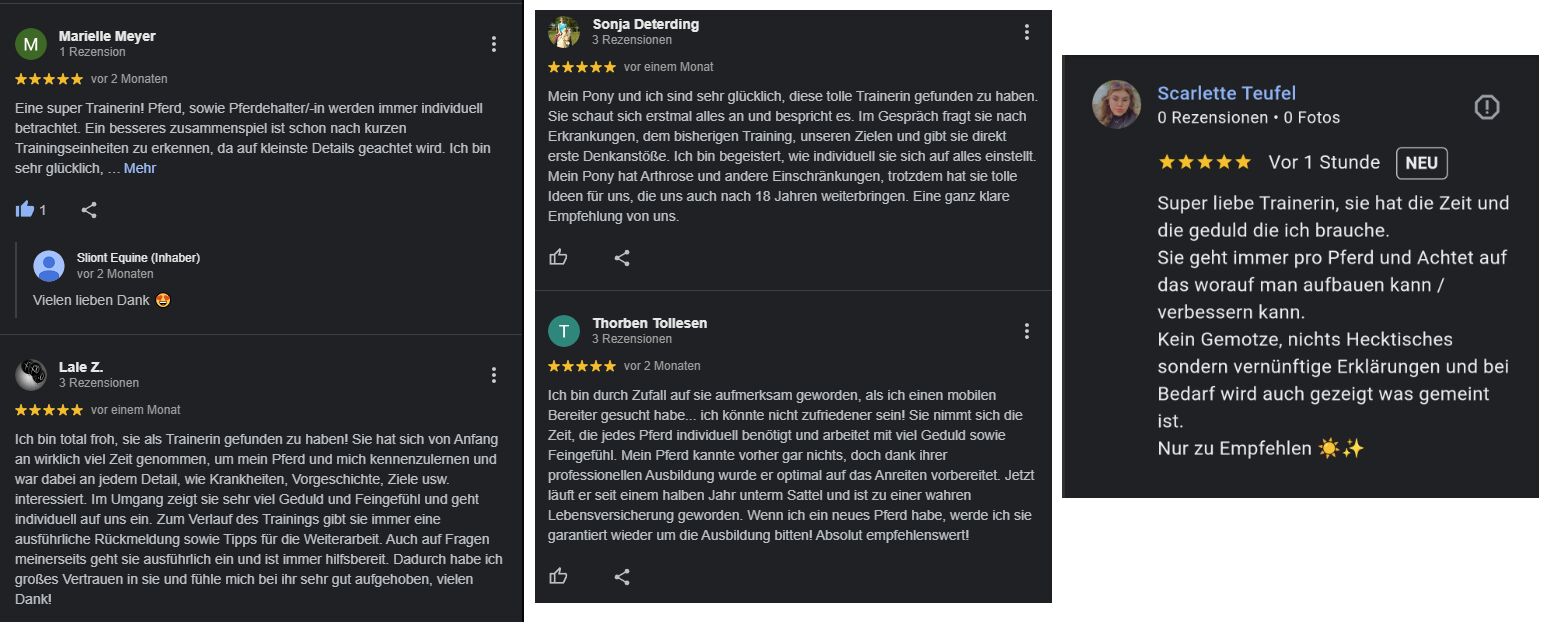 Mobilne lekcje jazdy konnej - indywidualnie i profesjonalnie Szukasz empatycznego i zindywidualizowanego wsparcia dla siebie i swojego konia? Przyjadę bezpośrednio do Twojej stajni i będę Ci towarzyszyć w drodze do większej harmonii i sukcesu - niezależnie od tego, gdzie aktualnie się znajdujesz. Oferuję również lekcje w szkołach jeździeckich na zasadzie freelance. Niezależnie od tego, czy twój koń traci elastyczność, czy też brakuje mu konkretnego aspektu treningu, udzielę ci profesjonalnej porady. Zawsze skupiam się na Twoich potrzebach i potrzebach Twojego konia. Moja oferta obejmuje: #Indywidualne korekty stylu jazdy i postawy konia #Lekcje jazdy konnej i pomocne wskazówki dotyczące treningu bez konia. #Doradztwo w zakresie sprzętu: czy to uzda, siodło czy inne akcesoria - pomogę ci znaleźć odpowiedni sprzęt dla twojego konia (cena za #doradztwo w zakresie sprzętu: 20 € za pół godziny). #Praca domowa dla ciągłego rozwoju Wszystkie style i dyscypliny jeździeckie mile widziane - zarówno z ziemi, jak i na koniu Praca z ziemi: # lonża #podwójna lonża #Praca z ziemi #Lekcje rozwijające Jazda konna: #korygowanie postawy jeźdźca #Błędy postawy podczas jazdy na koniu #Poprawa ujeżdżenia konia #Lekcje rozwijające #Poprawa odległości na trasie Trening mentalny: #Nauczanie wewnętrznego spokoju #Rozpoznawanie i minimalizowanie czynników stresowych #Trening bezstresowy #Metody alternatywne dla konia bez stresu i przymusu Opowiadam się za dobrze uzasadnionym i przyjaznym dla konia treningiem. Ważne jest dla mnie, aby dać Tobie i Twojemu koniowi czas na cieszenie się treningiem i zachowanie zdrowia w dłuższej perspektywie. Każda podróż treningowa ma swoje wzloty i upadki - a ja będę Ci towarzyszyć w tej podróży z alternatywnym podejściem i dużą dozą cierpliwości. Google Sliont Equine zarejestrowany. Strona internetowa wciąż w budowie. Ze względu na ochronę danych NIE wolno mi umieszczać w Internecie każdego konia, którego mam na lekcjach / treningu.