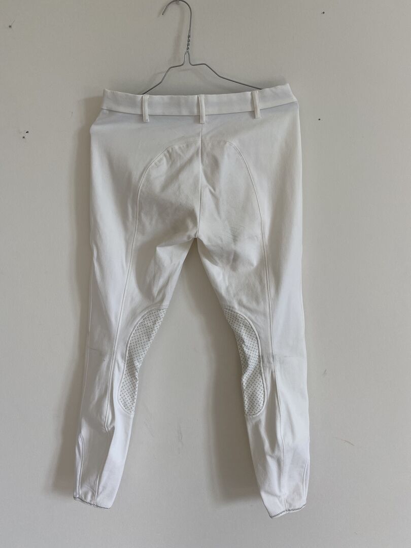Die Reithose wurde einmal verwendet. Nie stwierdzono żadnych odchyleń. Niewielkie, czarne plamy na siedzeniu i na spodzie. GEWASCHEN. GEBÜGELT.