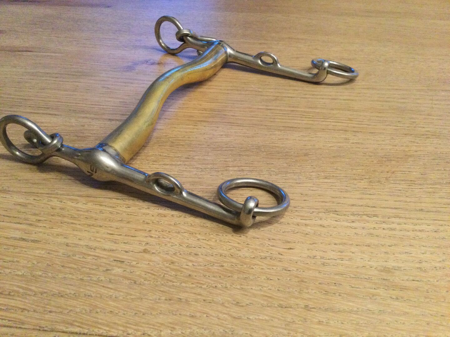 New School Curb Bit Pacifier Weymouth - Grubość 16 mm, szerokość 133 mm, homologacja LPO 7 cm Owalny, spłaszczony język wędzidła o grubości 16 mm jest odchylony do tyłu (ogonowo) pod kątem 45°. Gdy lejce są trzymane, wygina się pionowo nad językiem, tak że prawie nie wywiera się na niego żadnego nacisku. Odruch ciągnięcia języka w górę jest zredukowany, a smoczek ma najłagodniejszy efekt z naszych tradycyjnych ustników. Opcja dla koni, które reagują zbyt wrażliwie na pręt slimma, mają wystarczająco dużo miejsca między górnym i dolnym prętem oraz szczelinę w pysku, która nie jest zbyt krótka, aby uzda i pręt nie dotykały się. NP 250,00€