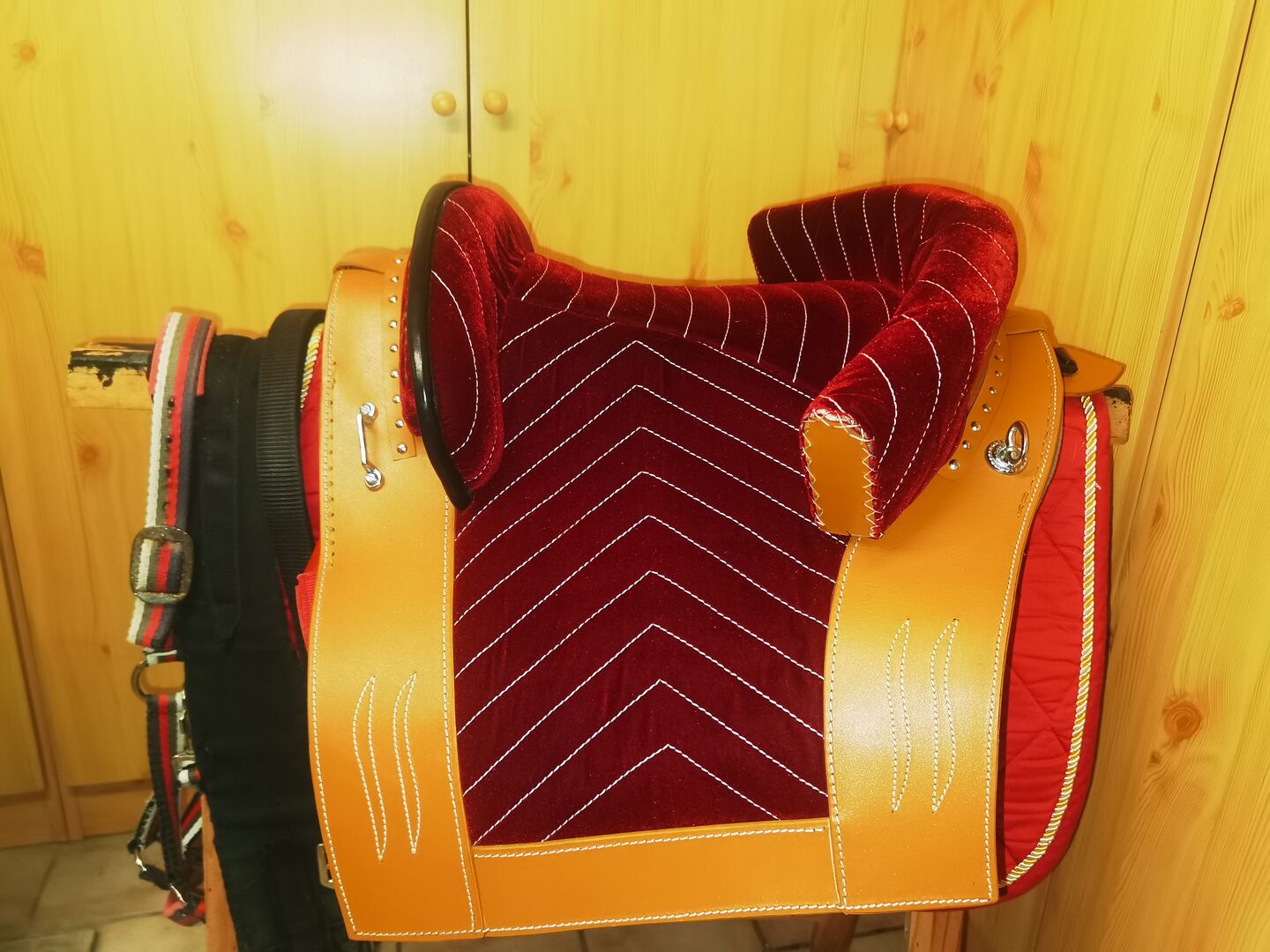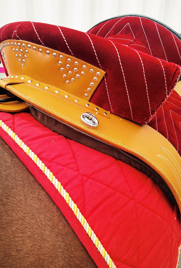 Siodło jest piękne i było na okrągłym krótkim pre do zdjęć. Pasuje idealnie, ale też od razu była świetna na trotuarze w stajni. Mocne mocowanie strzemion 3 pasy mocujące Cena wciąż aktualna. Przyjemne, miękkie siedzenie. Dopasowane kolorystycznie szachy barokowe i obwód są dołączone gratis. Długość ok. 48cm Czysta powierzchnia styku: własna szerokość miednicy (mierzona od przodu do tyłu) plus 2 cm, jak mi powiedziano na straganie. Idealne dla koni z krótkim grzbietem.