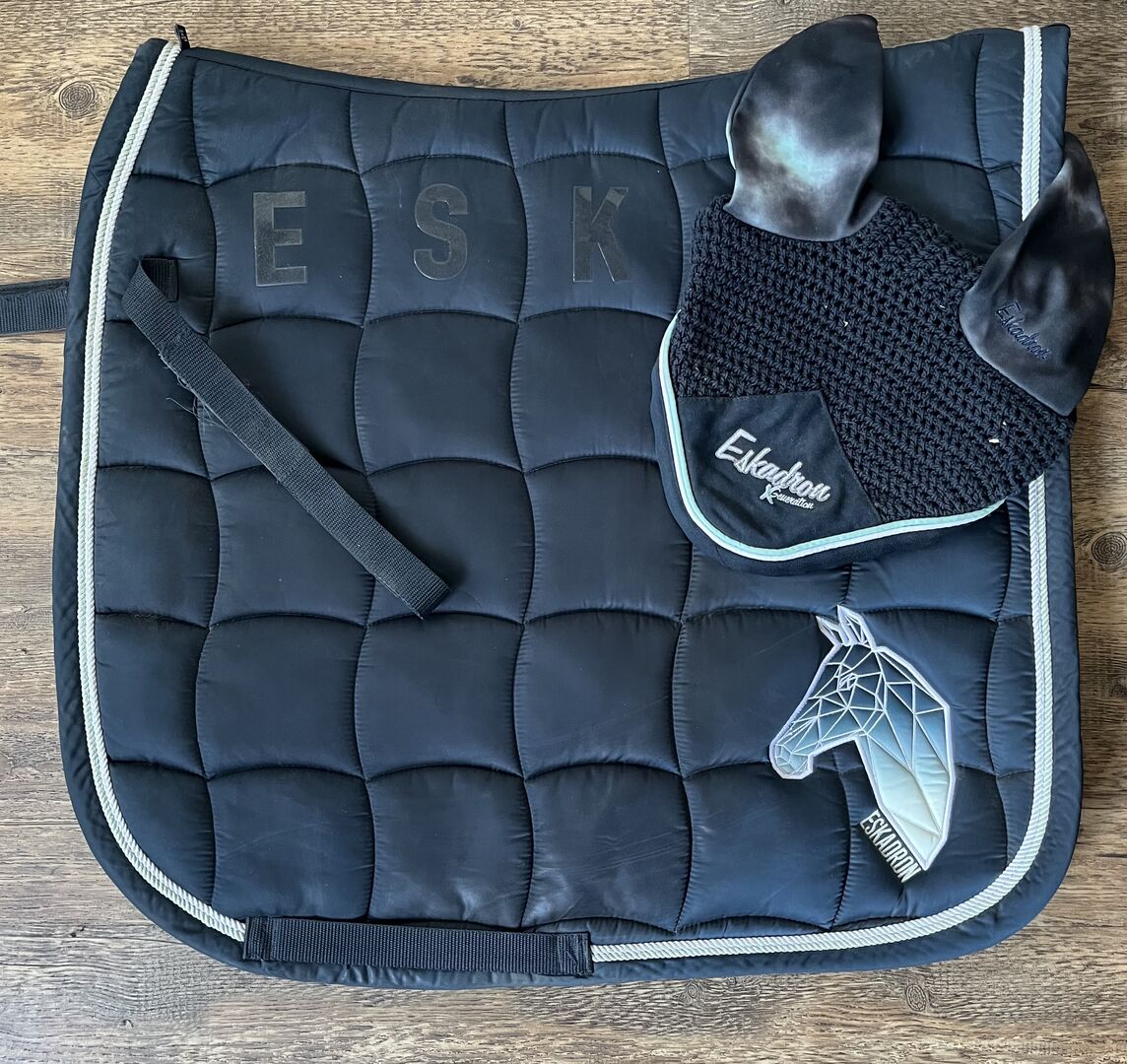 Niebieski Eskadron, podkładka pod siodło wraz z pasującą maską na muchy - Sprzedaż prywatna bez gwarancji Mało używana podkładka pod siodło, nie pasuje do mnie ze względu na kształt, dlatego jest na sprzedaż