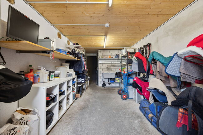 Otwarta stajnia o powierzchni boksów 70 m² znajduje się w strefie mieszkalnej i oferuje czterem koniom zdrowe i odpowiednie dla gatunku środowisko z dużą ilością świeżego powietrza. Pierwotnie zbudowano cztery boksy treningowe o wymiarach 3,5 m x 4 m. Trzy boksy i związane z nimi wybiegi, każdy o powierzchni 21 m², zostały przekształcone w otwartą stajnię. Oryginalne ściany boksów mogą być ponownie zainstalowane przy niewielkim wysiłku, aby umożliwić indywidualne stajnie. Czwarty boks treningowy nadal istnieje i może być wykorzystywany na przykład w przypadku choroby lub w celach integracyjnych. Stojak na siano i automatyczny podajnik są już zintegrowane z koncepcją otwartej stajni. Konia można odwiązać w szerokim korytarzu stajni pod solarium o regulowanej wysokości i przygotować go do sesji treningowej. Przestronne pastwisko o powierzchni 9 361 m² jest bezpośrednio połączone z otwartą stajnią.