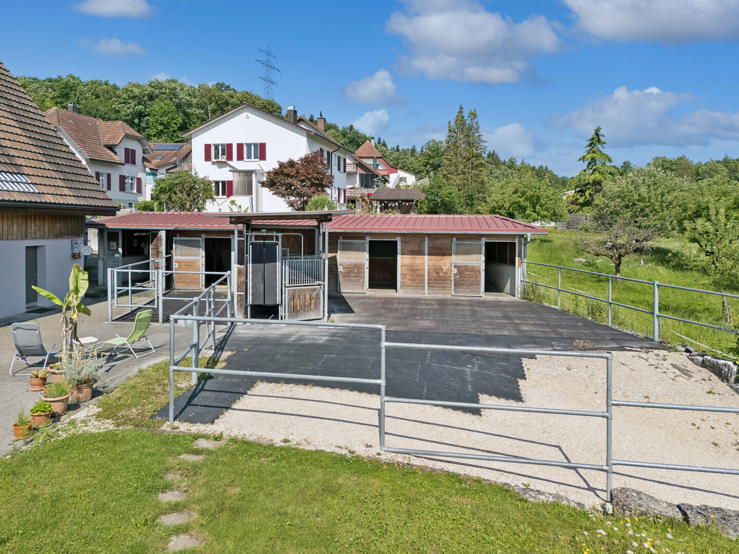 NIERUCHOMOŚĆ JEŹDZIECKA Z DWOMA LOKALAMI MIESZKALNYMI I MOŻLIWOŚCIĄ INDYWIDUALNEJ HODOWLI KONI - Ta wysokiej jakości nieruchomość jeździecka oferuje wiele możliwości na działce o powierzchni 10 579 m². Z tego 1,218 m² znajduje się w strefie mieszkalnej 1, a 9,361 m² w strefie rolnej (podlegającej prawu gruntów rolnych BGBB).