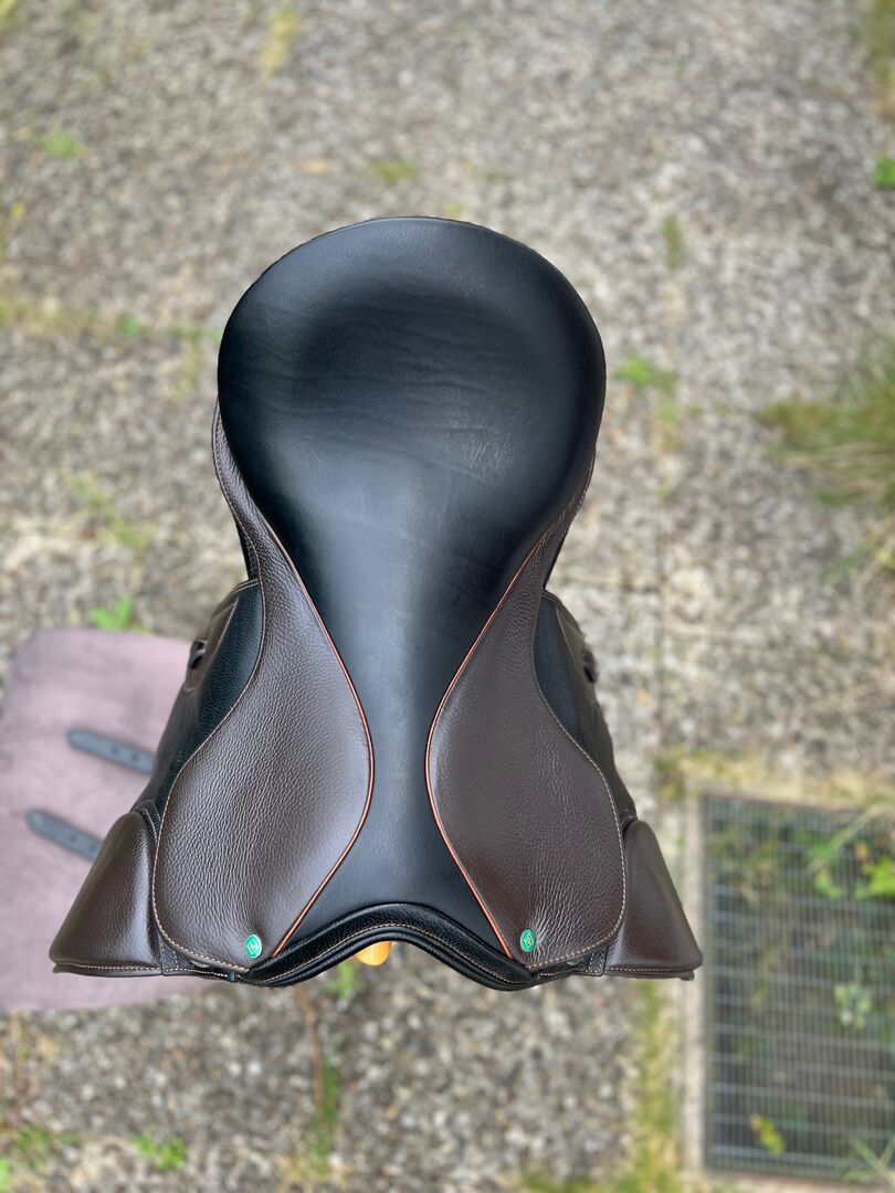 Siedzisko, panele, klapa siodła i pętle klapy z czarnej skóry cielęcej Stringi, mała klapa siodła, pięta na klapie siodła, półksiężyc oraz przedni i tylny popręg z brązowej skóry cielęcej Czarne lamówki i szwy w kolorze koniaku