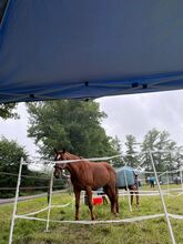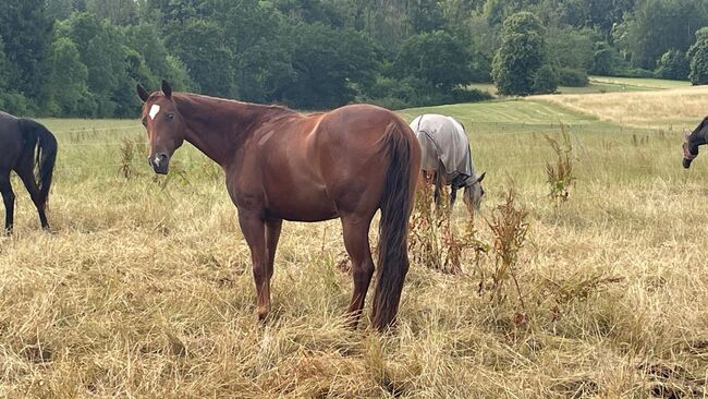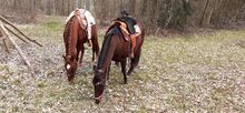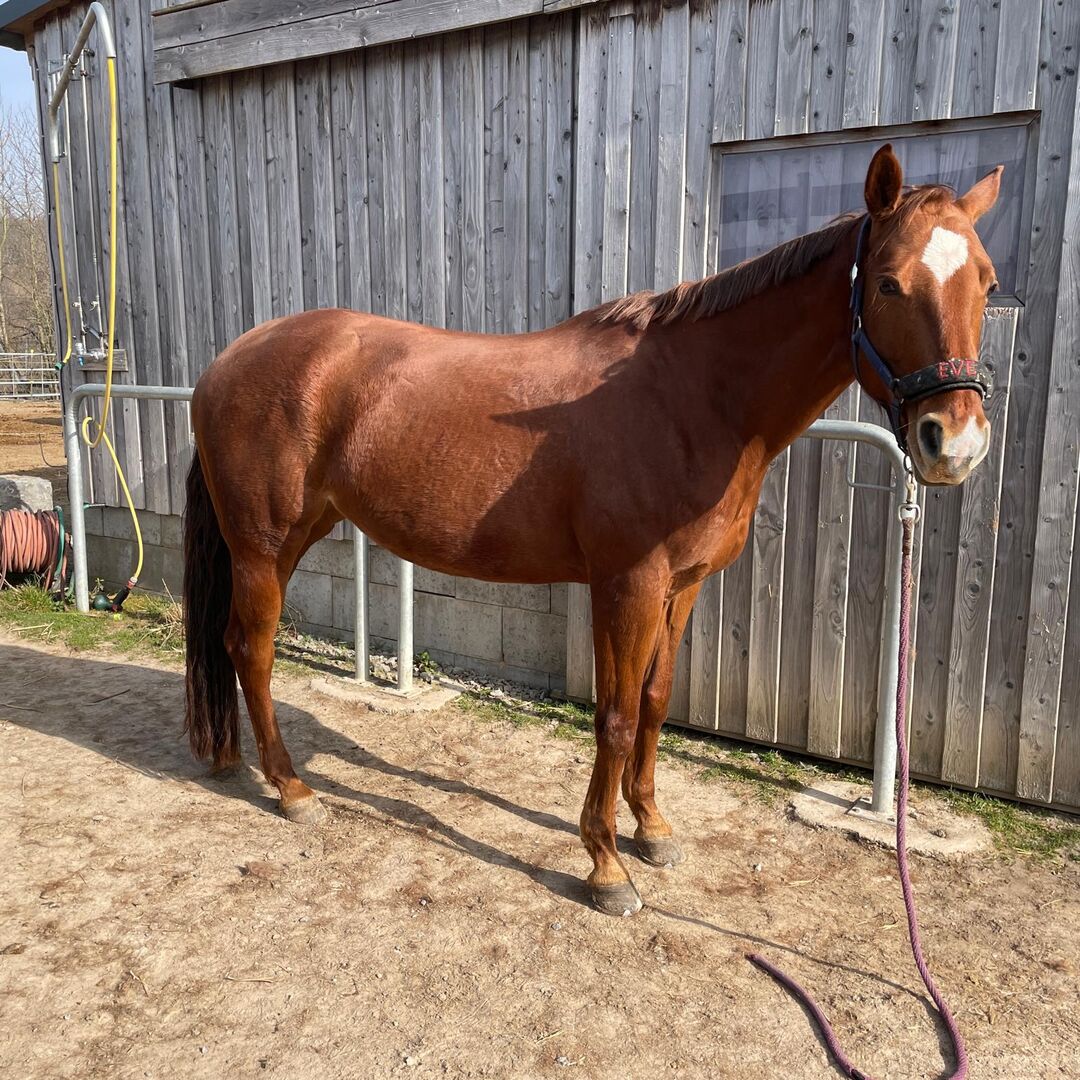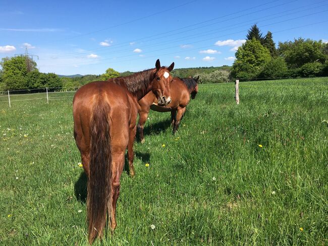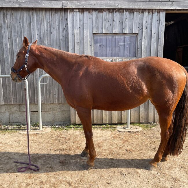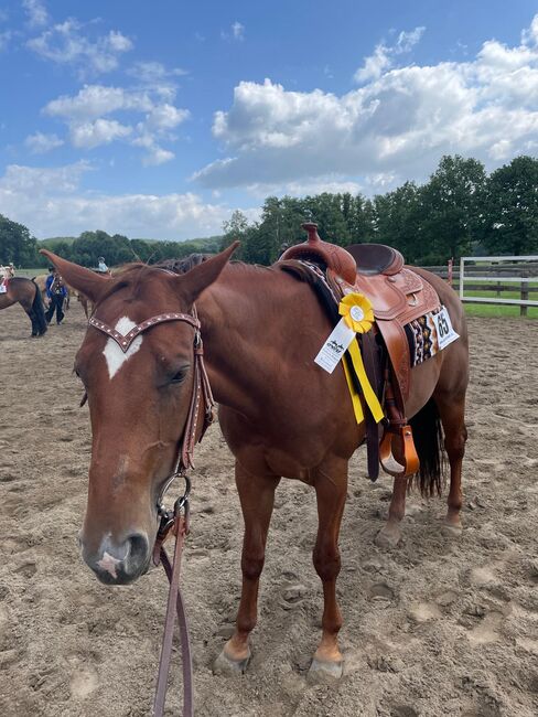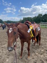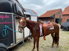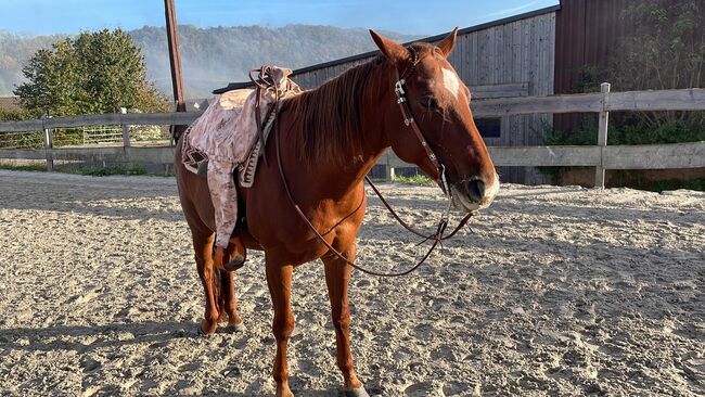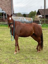 Niezawodna, urocza klacz rasy Quarter Horse z doświadczeniem wystawowym - Lokalizacja: 37640 Warbsen TFR A Blaze Of Glory to piękna klacz rasy Quarter Horse o dużej ramie i prawidłowej budowie. Urodziła się w styczniu 2016 roku, ma kasztanowate umaszczenie i ok. 163 cm wzrostu. "Eve" to klacz o bardzo słodkim charakterze. Jest bardzo zorientowana na ludzi, przyjazna i ciekawa oraz zawsze nieskomplikowana i zrelaksowana w codziennych kontaktach. Jest bardzo dobrze wychowana i przyjemna w obsłudze. Eve jest dobrze wychowana, zaszczepiona i regularnie odrobaczana. Eve jest przyzwyczajona do przebywania w boksie z wybiegiem i pastwiskiem, a także w otwartej stajni i jest bardzo towarzyska i zgodna ze stadami. Pod siodłem jest spokojna, dobrze wychowana i przyjemna w jeździe. Ma miękkie, dobre chody i bardzo wygodnie się na niej siedzi. Jest również wyrozumiała na błędy w jeździe, dlatego nadaje się również dla początkujących. Jednocześnie ma wiele chęci i talentu do nauki i może być świetną zabawą dla ambitnego jeźdźca. Dobrze radzi sobie z pomocami i jest dobrze wyszkolona. Eve ma bardzo dobre wykształcenie westernowe i była nieustannie szkolona przez trenerów, a także rozwijana na różnych kursach. Była już z powodzeniem pokazywana w Ranch Riding, Ranch Rail, Trail, Pleasure i Horsemanship. Zaczęła uczyć się latającej zmiany w kłusie, ale nie jest to jeszcze całkowicie pewne. Jest również zawsze spokojna i nieskomplikowana w terenie, nawet gdy podróżuje sama. W 2020 r. zdiagnozowano u niej spavin jako przypadkowe odkrycie podczas ogólnego badania, ale jak dotąd nie wykazała żadnych ograniczeń ani kulawizny. Zdjęcia rentgenowskie można oczywiście obejrzeć. W 2025 r. zdiagnozowano u niej również rolki kopytowe na obu przednich kopytach. Następnie przeszła terapię komórkami macierzystymi, która zadziałała bardzo dobrze i od tego czasu jest wolna od kulawizn. Według weterynarza, kowala i trenera jest obecnie w 100% obciążona. Biega w specjalnych butach z przodu i boso z tyłu. Różne zdjęcia rentgenowskie i ogólne badanie są dostępne do wglądu. Eve jest świetnym koniem dla ambitnego jeźdźca, który nie zraża się jej diagnozą i chce kontynuować z nią pracę. Niezależnie od tego, czy chodzi o zawody, czy o niezawodnego partnera rekreacyjnego - jest po prostu uroczym koniem.