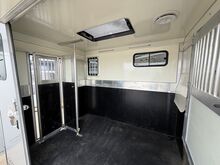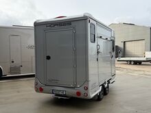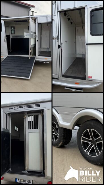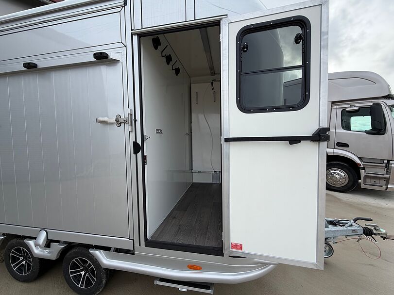 Podłoga wykonana z profili aluminiowych z przyklejony do gumowej podłogi o wysokiej wytrzymałości, W pełni izolowane panele boczne i dachowe o grubości 30 mm, aerodynamiczny przód Zamykane drzwi boczne po prawej stronie ze składanym stopniem, przechowalnia sprzętu, składane łóżko (łóżko awaryjne), 2 półki sufitowe zintegrowane z przednią ścianą, obrotowy uchwyt na 2 siodła, zaczepy do szafki na sprzęt, wiele haczyków na uzdy i płaszcze Rampa boczna z klapą wentylacyjną powyżej, 2 opuszczane okna przy głowach koni, dodatkowe podłużne okno przesuwne, duży luk dachowy, elektryczny wywietrznik dachowy przełączany z siodlarni, środkowa przegroda z wysokimi prętami i przezroczystą zasłoną, ścianka dla ogierów przy głowach koni, deska przy rampie, duże drzwi zewnętrzne z tyłu, dwie bardzo stabilne ścianki dla ogierów przy tylnych drzwiach, indywidualny dostęp do obu koni w każdym przypadku