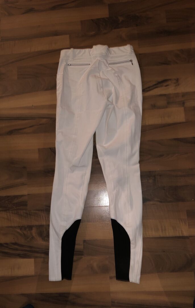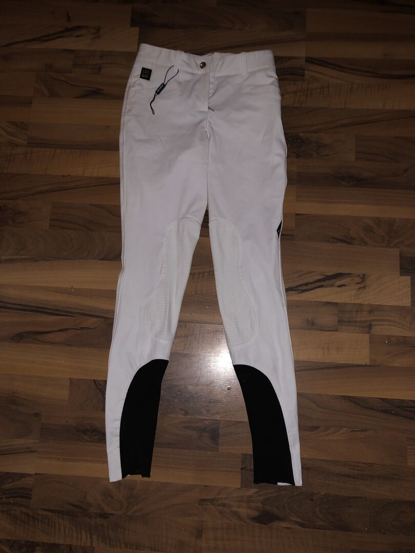 Nowe bryczesy Equiline White - Niestety zapomniałem odesłać je na czas po przymierzeniu. Spodnie EQUILINE są więc fabrycznie nowe i nie miały jeszcze kontaktu z koniem. Mają rozmiar 36, są białe i mają patki na kolanach z uchwytem. Niestety nie pasowały na mnie.