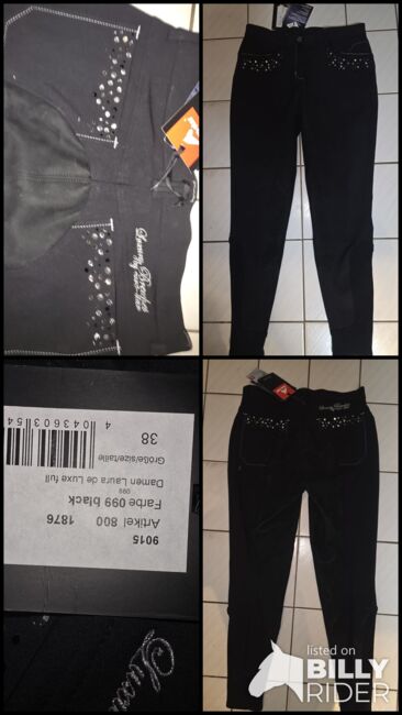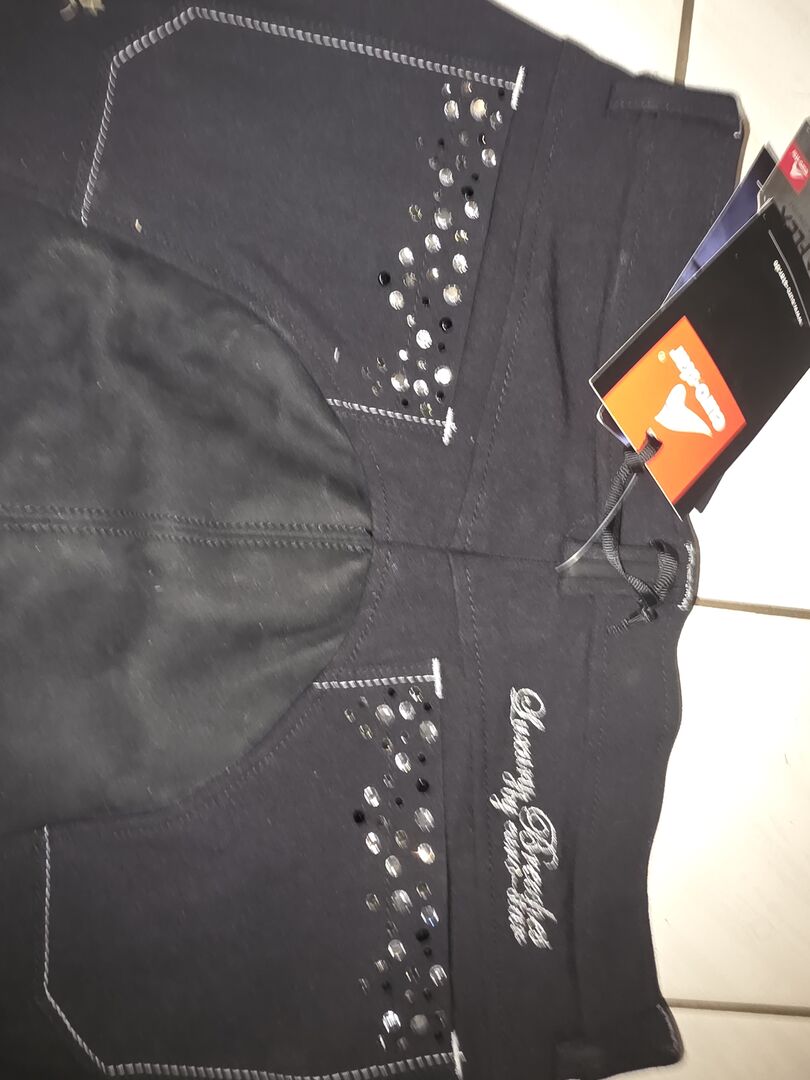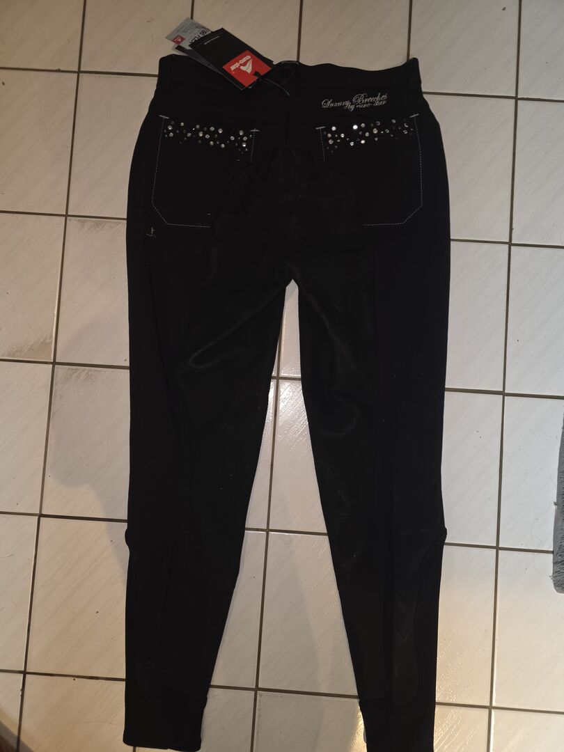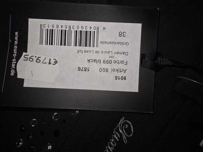 Nowe bryczesy od Euto-Star - Nowe i nienoszone bryczesy z pełnym siedziskiem Euro-Star, czarne, rozmiar 38, świetne błyszczące aplikacje z przodu i z tyłu