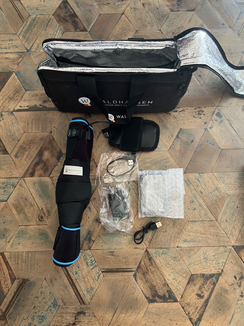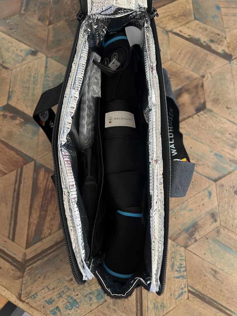 Opis od Waldhausen: "Ochraniacz W-Health & Care firmy Waldhausen to innowacyjne narzędzie do pielęgnacji koni, które łączy wibracje, ciepło i chłodzenie w jednym produkcie. Jest idealny do rozgrzewki, regeneracji po wysiłku lub w przypadku kontuzji. Wibrator wspomaga krążenie krwi, zmniejsza obrzęki i wspomaga regenerację ścięgien. Dzięki trzem indywidualnie regulowanym poziomom intensywności, każda funkcja może być optymalnie dostosowana do potrzeb konia".