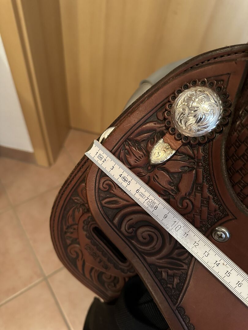 Siodło ma elastyczne drzewo Flex Fit M, siedzisko 16 ", kolor kasztanowy z antycznym wykończeniem, tapicerkę siedziska ze skóry nubukowej w kolorze piaskowym, siedzisko jeździeckie i wywinięte, skręcony błotnik o długości M, szlachetne srebrne konchy z dodatkowymi srebrnymi końcówkami 6x, wyszukane i szczegółowe oznakowanie 7/8, obramowanie i oprzyrządowanie koszyka, w tym aluminiowe strzemiona. Róg jest pokryty surową skórą i ozdobiony srebrnym concho pośrodku.
