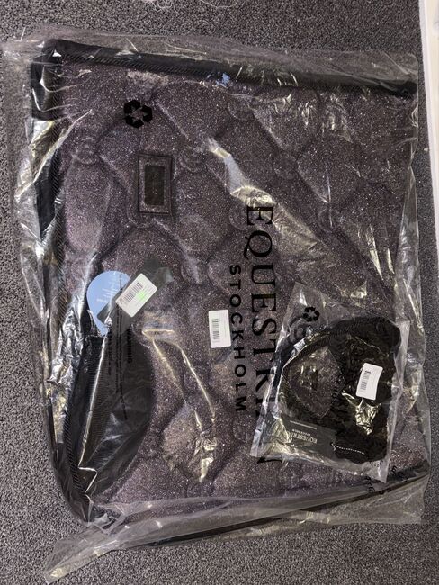 NOWOŚĆ OVP Equestrian Stockholm Set Purple Glimmer Saddle Pad Hood - Sprzedam nowy i wciąż zapakowany komplet Equestrian Stockholm Glimmer Purple. Podkładka pod siodło jest w ujeżdżeniówce, maska w warmblood/full :)