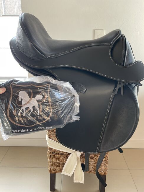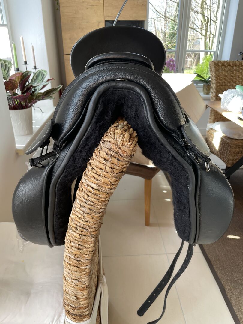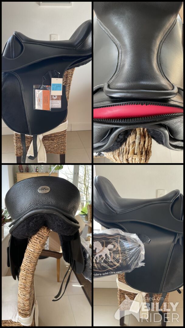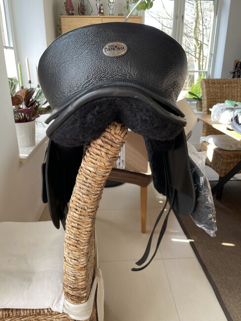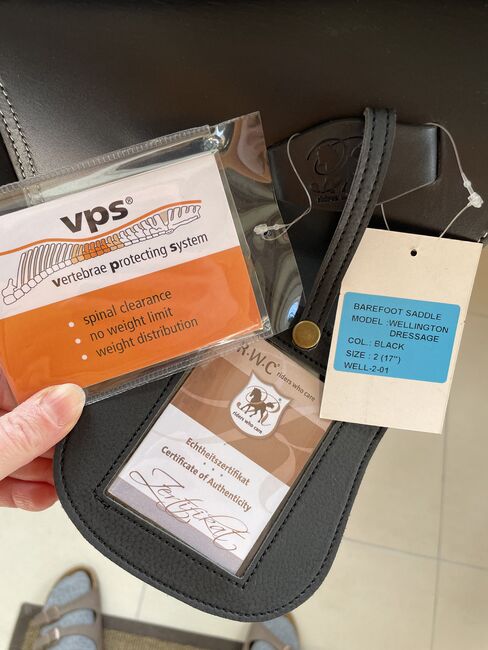 Nowy Barefoot Wellington, rozmiar siedziska 2 - Oferuję NOWE siodło ujeżdżeniowe Barefoot Wellington w rozmiarze siedziska 2, kolor czarny. W komplecie podkładki pod siodło, duże i małe wałki kolanowe, wymienny szeroki czerwony popręg (można również zamienić na szary). W związku z reklamacją otrzymałam nowe siodło. Siodło nie było nawet "testowane" na koniu - jest więc absolutnie nowe i nieużywane. Bez włosia. NP 1.279€
