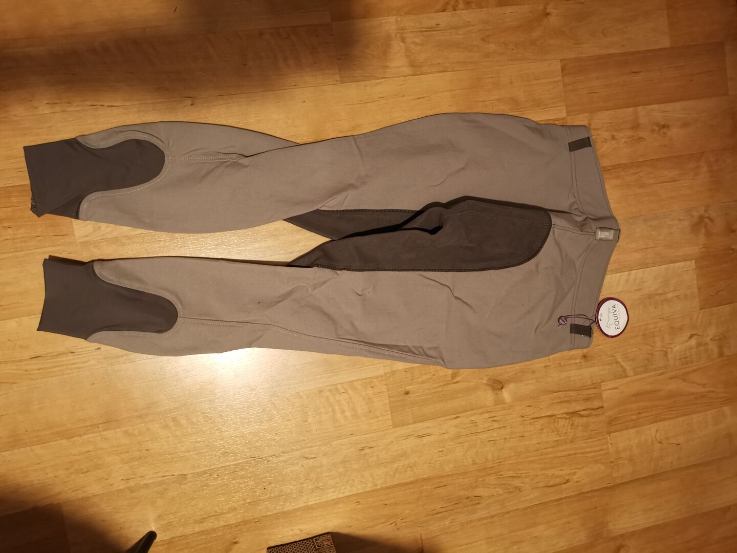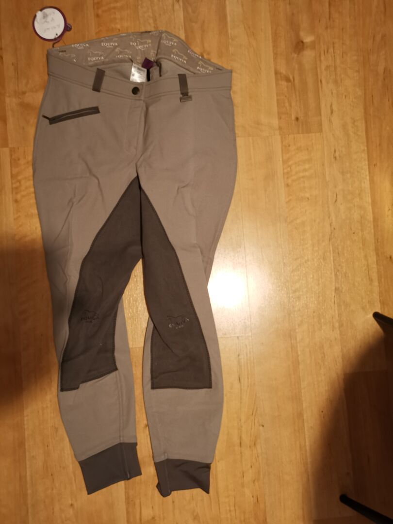 Nowy! Bryczesy jeździeckie Equiva jasnoszare/brązowe ze skórzaną wstawką, rozmiar 44 - Nowe, cudowne buty Equiva na lato, z kieszenią w kolorze mosiądzu i elastycznym ściągaczem w okolicy kostki (nie jest to ściągacz do butów, lepiej pasuje też do sukienki!). Mit Originaletikett und Original Preis (€119,90). Weich und strapazierfähig.