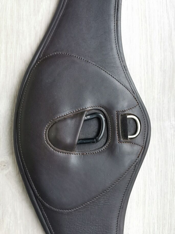 Z anatomicznie ukształtowanym środkowym pasem, który dobrze rozkłada ciężar i zmniejsza nacisk na mostek konia podczas skoków. Popręg skokowy jest wykonany z byczej skóry i ma wytrzymałe trójwarstwowe gumy po obu stronach z rolkowymi sprzączkami ze stali nierdzewnej. Długość 145 cm, kolor ciemnobrązowy.