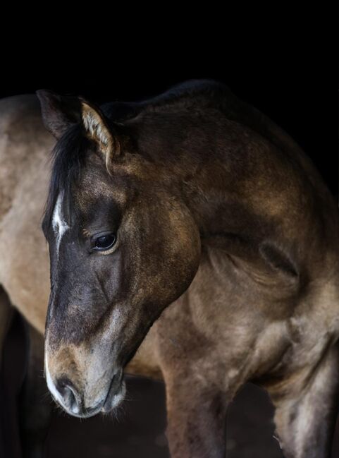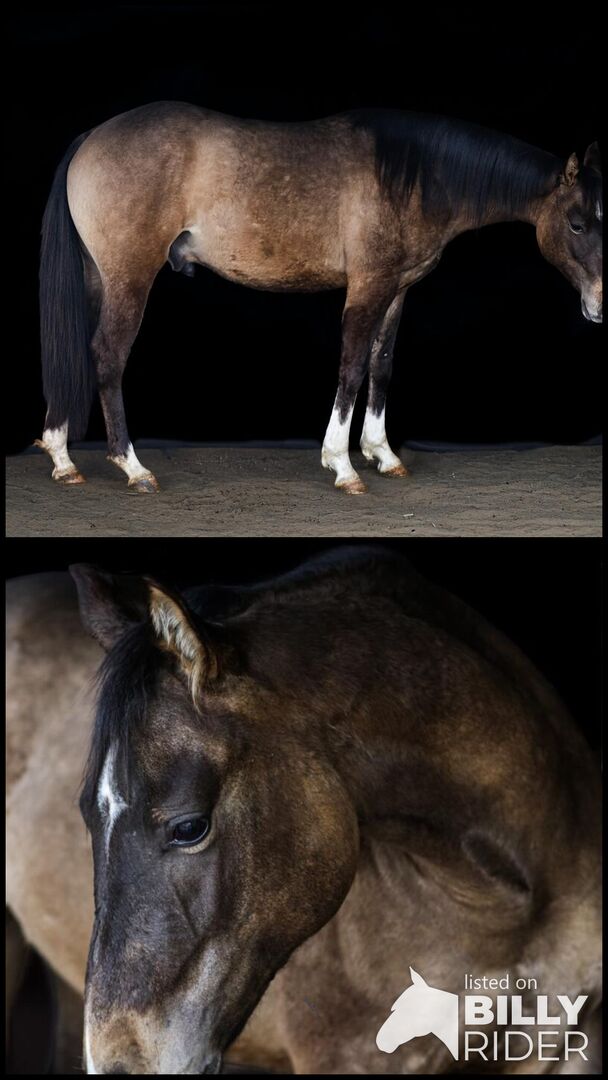 Obiecujący młody ogier rasy Quarter Horse w derce - Lokalizacja: 55777 Berschweiler AS Hollyshiningstar to ogier rasy Quarter Horse, urodzony 10.06.2024 r., w rzadkim i atrakcyjnym kolorze Dunskin. Jego spodziewany ostateczny wzrost to około 150 cm. Jest pięknym, niezwykłym, przyciągającym wzrok ogierem o dużej prezencji i charyzmie. Jego harmonijna budowa, prawidłowa budowa i dobre umięśnienie czynią go bardzo typowym młodym ogierem. Jego spokojne, jasne spojrzenie jest szczególnie uderzające i odzwierciedla jego zrównoważoną naturę. Jest zdrowy, regularnie odrobaczany i zna zarówno weterynarza, jak i kowala. Hugo dorastał w stadzie młodych ogierów w sposób odpowiedni dla swojego gatunku, dzięki czemu rozwinął doskonałe umiejętności społeczne i jest absolutnie bezproblemowy w kontaktach z innymi końmi. Jego charakter charakteryzuje się zorientowaniem na ludzi, uprzejmym i bardzo dobrze wychowanym zachowaniem oraz nieskomplikowaną naturą w życiu codziennym. Jest otwarty, ciekawski, uważny, a jednocześnie spokojny i zrelaksowany. Hugo jest również chętny do nauki i dlatego ma najlepsze warunki do dalszego szkolenia. Jest wyszkolony w halterze i opanował źrebięce ABC, przycinanie kopyt, pielęgnacja i codzienne czynności nie stanowią dla niego problemu. Dzięki dobremu rodowodowi reiningowemu (Hollys Electricspark) oferuje idealne warunki na przyszłość w sporcie, rekreacji lub hodowli. Będzie sprzedawany z papierami AQHA i paszportem konia. Bardzo interesujący młody koń dla każdego, kto szuka wyjątkowego konia z charyzmą, jakością i najlepszym charakterem. NRHA Niemcy opłacone.