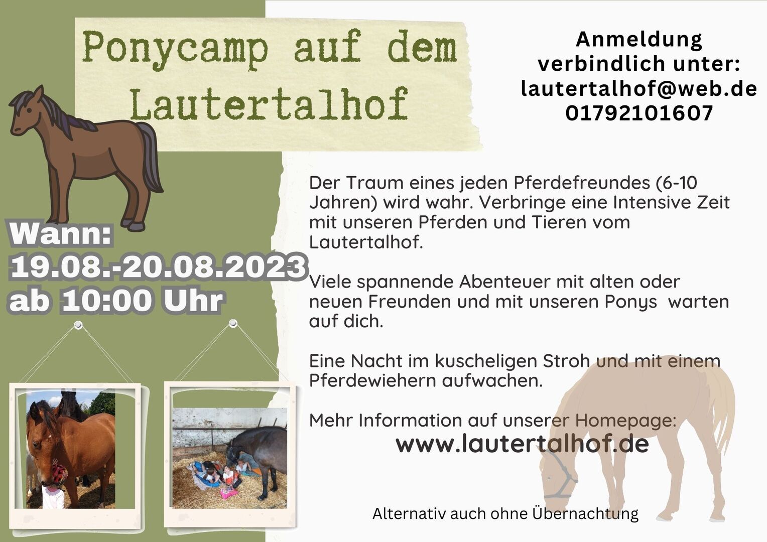 Obóz dla kucyków w Lautertalhof - Chcemy przeżyć z Tobą ekscytujący weekend konny w dniach 19.8-20.08. Dla wszystkich miłośników koni w wieku 6-10 lat (ewentualnie również dla 11 i 12-latków). Przytulanie się do kucyków, jazda konna, zabawy wokół koni i z końmi, nocne wędrówki w towarzystwie naszych koni, opieka nad końmi, spanie w słomie tuż obok kucyków i wiele więcej czeka na Ciebie...... Zarejestruj się już teraz na stronie: lautertalhof@web.de Więcej informacji na naszej stronie www.lautertalhof.de