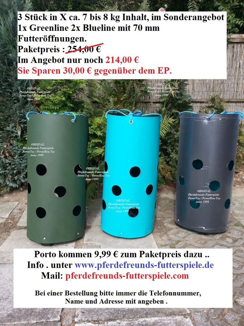 w przypadku pytań lub zamówienia wyślij do nas e-mail. Informacje również na stronie www.pferdefreunds-futterspiele.de Zobacz również inne nasze ogłoszenia. Wybrane przez nas materiały są niemal niezniszczalne przy odpowiednim obchodzeniu się z nimi. Model XL Pojemność ok. 120 litrów ok. 8 do 12 kg Wysyłka za 1 sztukę 7,99 € 2 do 3 sztuk 9,99 € od 4 sztuk 14,99 € Dokarmiając za pomocą PowerToy / PowerHeu - Toy wydłużamy czas karmienia zwierząt . Konie, które mają kaszel lub choroby płuc kaszlą mniej niż zwykle. Konie mają zapewniony ruch, są bardziej zrównoważone i mniej nerwowe. Niewłaściwe zachowania ustają, bo konie są zajęte. Straty paszy są zmniejszone o około 60 %. PowerToy / PowerHeu-Toy powoduje niewielki lub żaden odgłos stukania. Dlatego nadaje się również bardzo dobrze do dużych stajni. PowerToy / PowerHeu-Toy nie musi być zabezpieczony przed uderzeniem żadnymi pasami. Niemożliwe są prawie żadne obrażenia, ponieważ uwzględnione są z góry ustalone punkty przełamania. Wszystkie produkty są wolne od plastyfikatorów i dodatków lotnych. Nasze materiały spełniają najwyższe standardy zrównoważonego rozwoju środowiska i są dopuszczone do kontaktu z żywnością. Odporne na temperaturę do -25°C, więc nie ma mowy o odpryskach czy pękaniu. Odporne na promieniowanie UV i wszelkie warunki atmosferyczne zgodnie z najnowszym stanem rozwoju. Przekonaj się... Twój koń ci za to podziękuje.