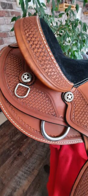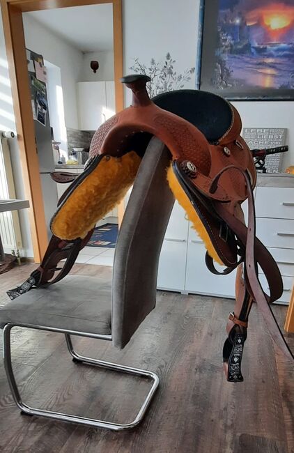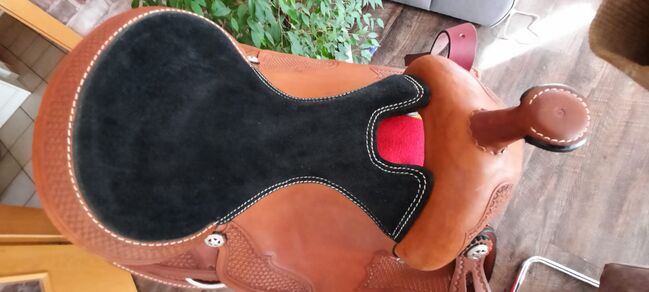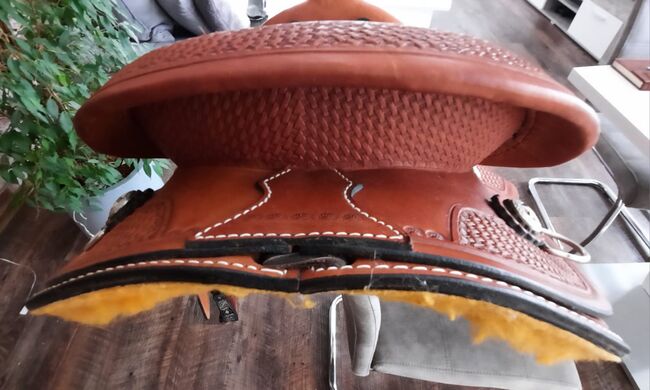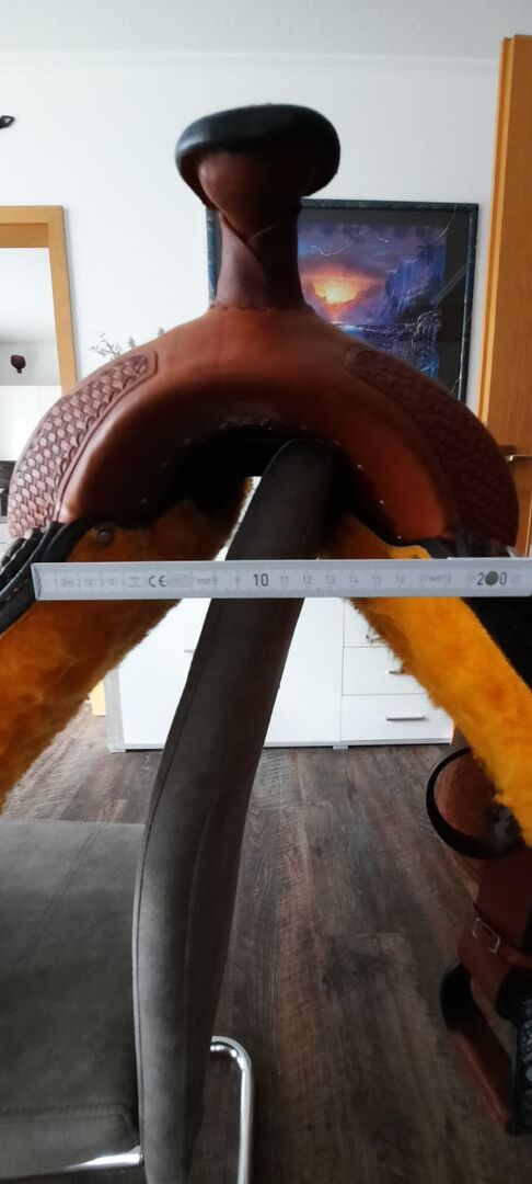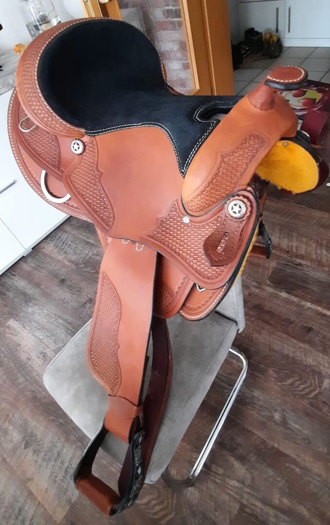 Pierwszej klasy westernowe siodło z bardzo ładnym wykrojem i świetnym krojem aluminiowych strzemion, było na koniu tylko do przymiarki. Siedzisko: 40cm Szerokość w kłębie: 20cm Długość całkowita: 61cm NP: 750€ VB: 399 € plus koszty wysyłki Whatsapp 0151-68504384