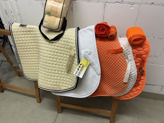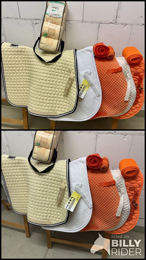 W zestawie znajdują się: - Kremowa podkładka pod siodło od Eskadron (zupełnie nowa) z zestawem bandaży - Biała podkładka pod siodło od HKM (również nowa) - Dwie pomarańczowe podkładki pod siodło z pasującymi bandażami - Kolejny biały pad pod siodło