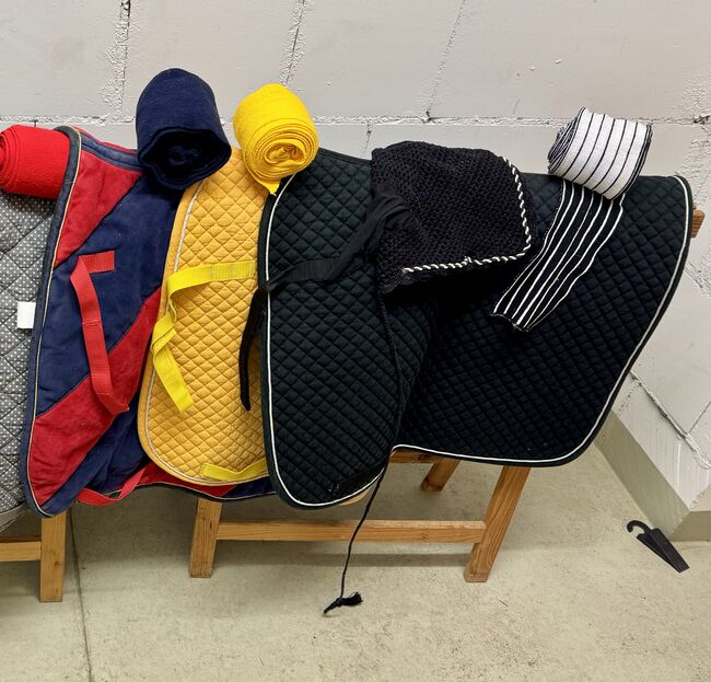 Okazyjny pakiet z 7 podkładkami pod siodło ujeżdżeniowe, 18 bandażami i uszami na muchy - Na sprzedaż jest kolorowy pakiet 7 podkładek pod siodła ujeżdżeniowe w różnych kolorach.