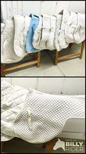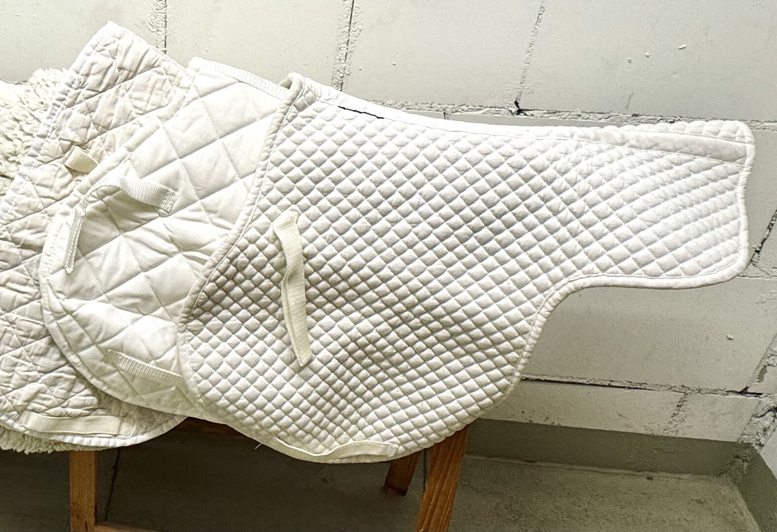Opakowanie 13 ściereczek do siodeł - 11 sztuk białych, 1 niebieska, 1 czerwona - Sprzedam pakiet 13 derek pod siodło dla koni. Paczka zawiera: - 11 białych derek skokowych (w tym 2 nowe) - 1 jasnoniebieskie siodło VSd / ujeżdżeniowe z wyściółką kłębu - 1 czerwona derka ujeżdżeniowa bez zdjęcia