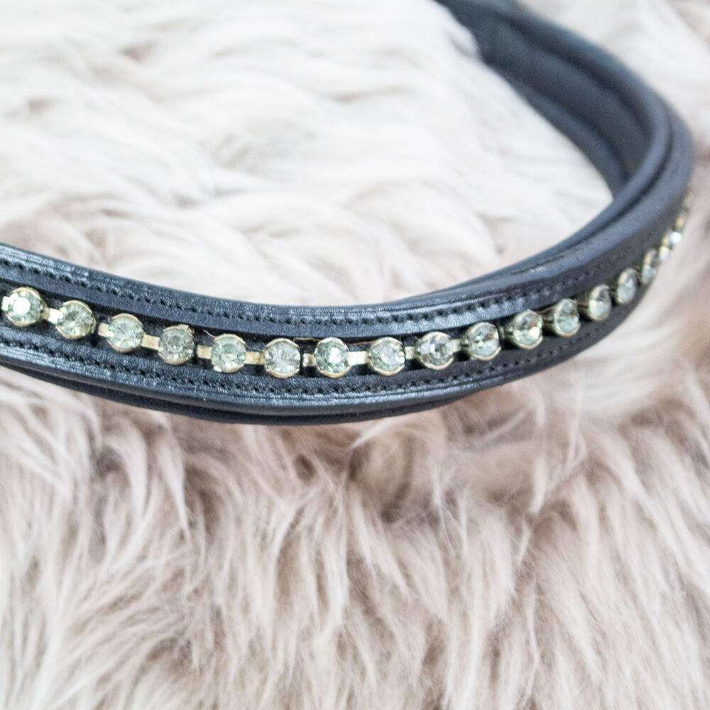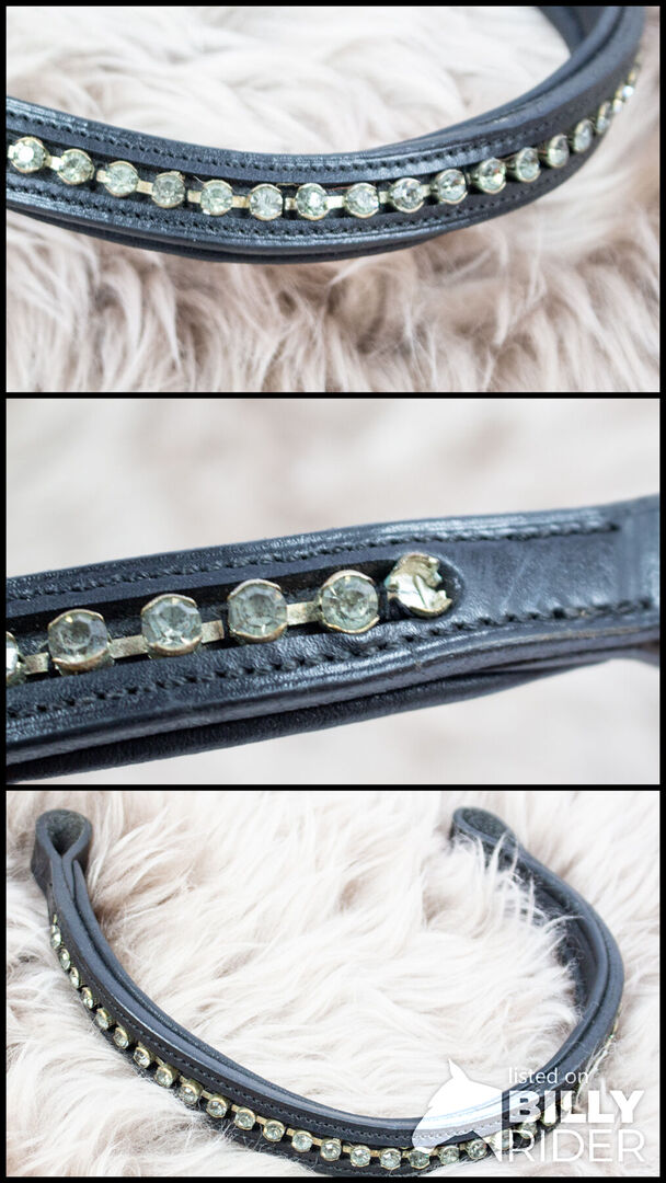 Opaska na oczy "biała" PEŁNA - Ta opaska na czoło konia przyciąga wzrok. Piękne i duże białe kamienie są ułożone w rzędzie. Jest on wykonany z czarnej skóry i lekko zakrzywiony. Opaska na czoło wykazuje bardzo nieznaczne ślady zużycia i brakuje jednego kamienia. To the seller's offerlaunch