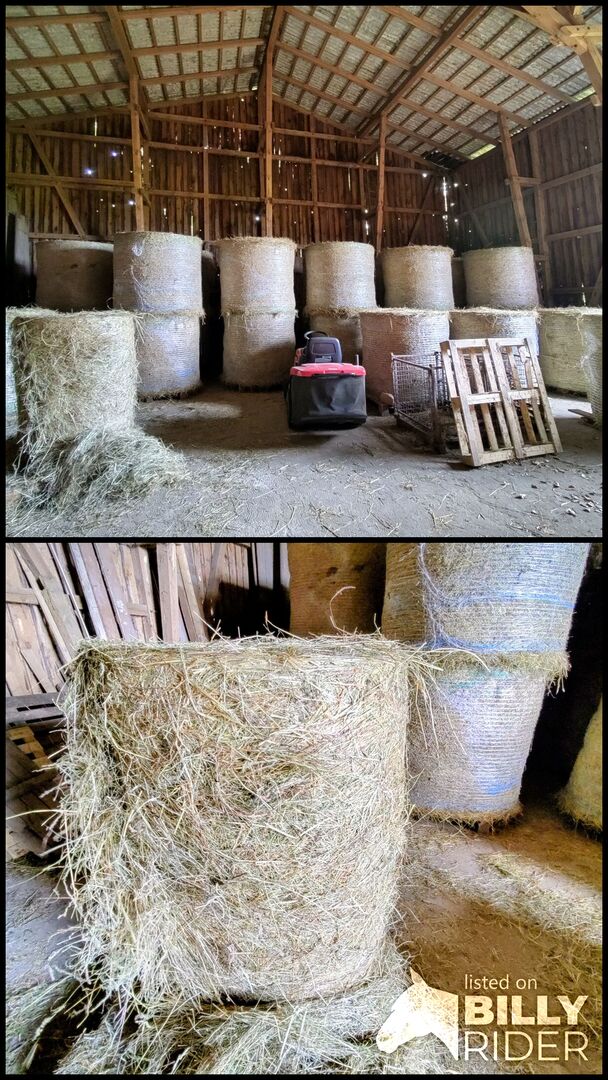 Organiczne siano w okrągłych belach, przechowywane w stodołach, bogate w strukturę - Bogate strukturalnie siano organiczne w okrągłych belach, ok. 1,30 m, przechowywane na sucho w stodole, w 100% wolne od JKK, jako pasza dla własnych koni! Dostępne zbiory 2025 lub 2024, 1. cięcie