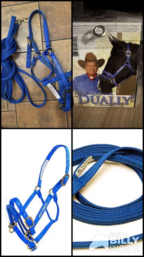 Oryginalny halter treningowy Monty Roberts (pełny) z linką do lonżowania i płytą CD z ćwiczeniami - Oferuję używany halter Monty Roberts Dually. Rozmiar L (niebieski) odpowiedni dla dużych koni rasy warmblood Kantar jest w idealnym stanie, ma tylko trochę zabrudzeń. W komplecie linka do lonżowania. W komplecie oryginalna płyta CD