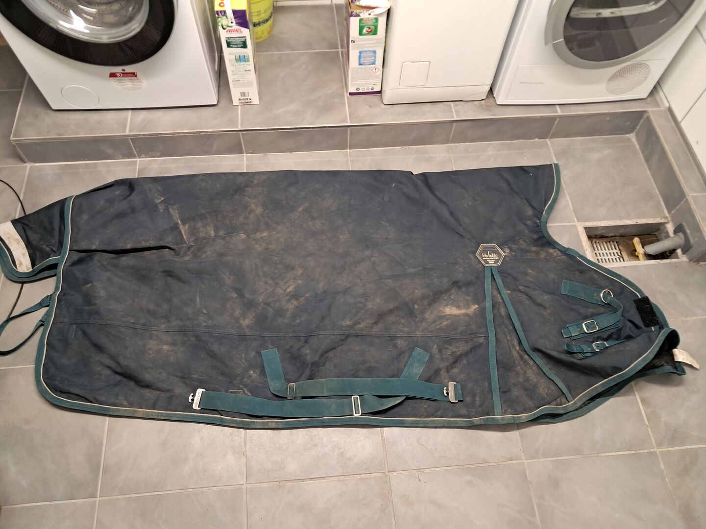 Osłona przeciwdeszczowa Perfect Fit 100g - Dywanik z wysokim kołnierzem, wypełnieniem 100 g, krzyżowymi sprzączkami i klapką na ogon. Kolor ciemnoniebieski. Wyprany i zaimpregnowany. Niestety nie jest w 100% czysty. Nowa cena ok. 130€ Sprzedaż prywatna