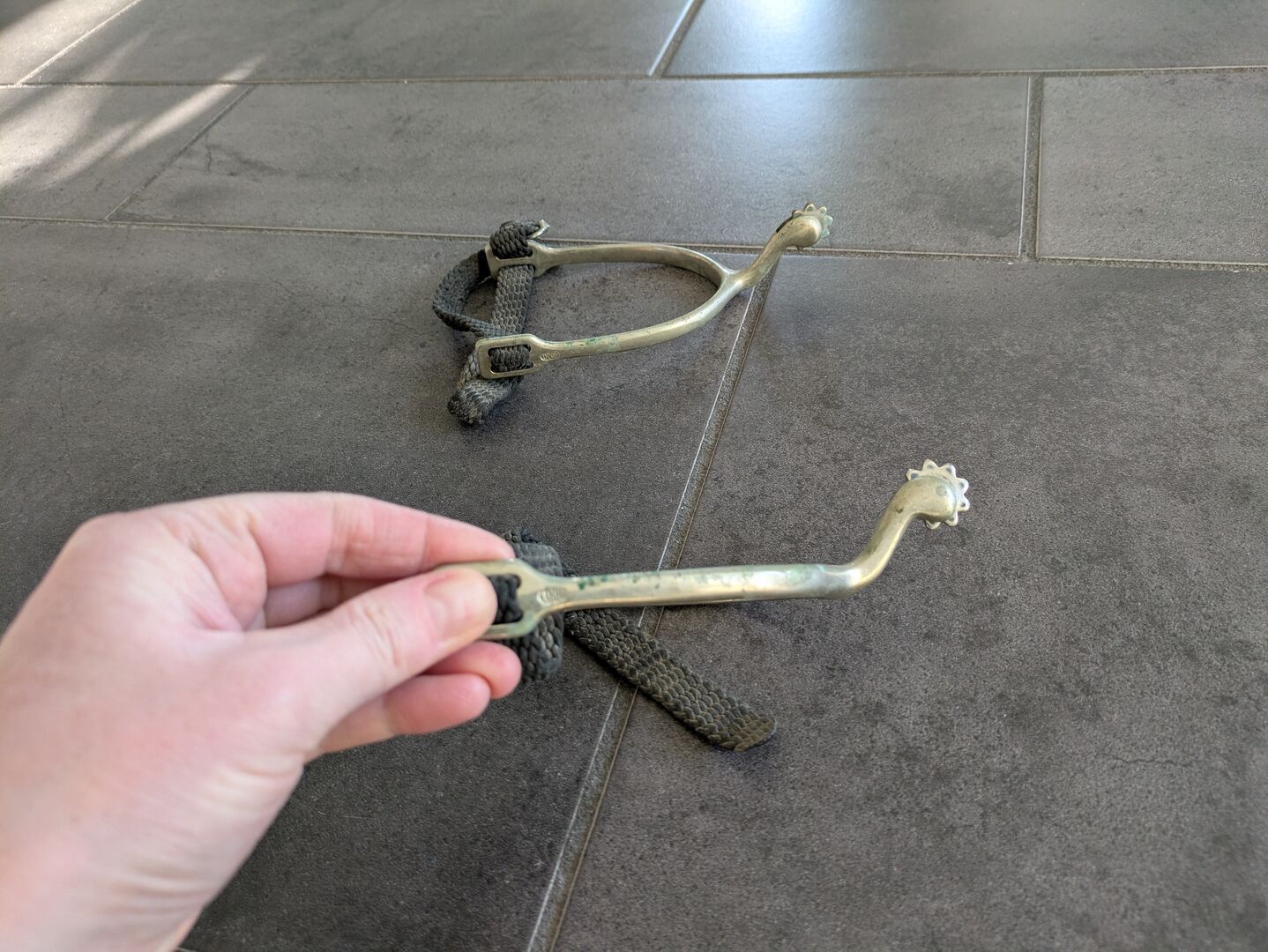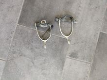 Ostrogi z łabędzią szyją i ząbkowanymi kółkami - Ostrogi na gęsiej szyi z ząbkowanymi kołami i paskami do ostróg na sprzedaż.