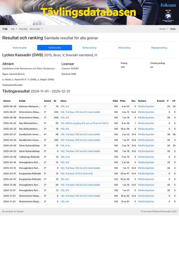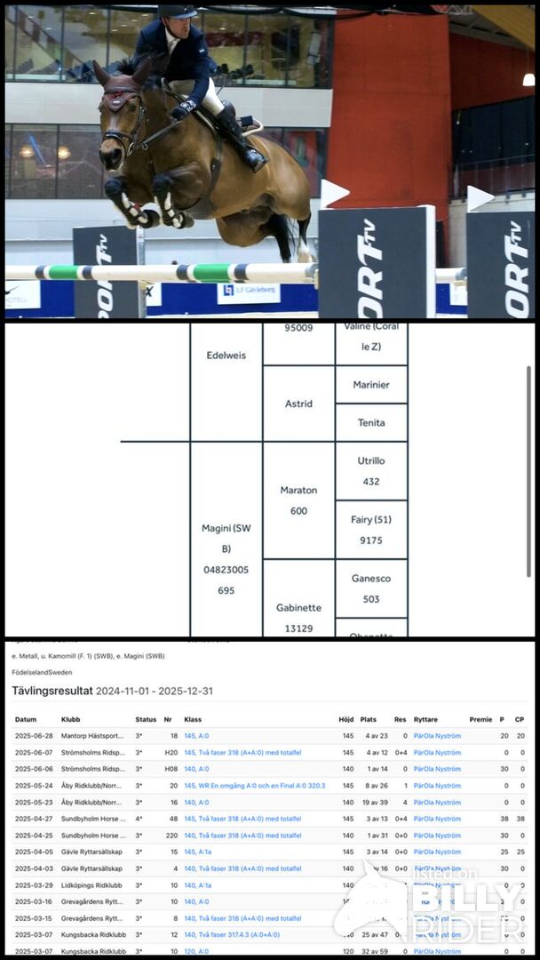 Ostrożny skoczek - Kassi to przyjemny i miły koń. Jest dobrze wyszkolony na płaskim terenie i ma dobre wyczucie skoków - jest szybki, zwinny i łatwo skręca. Jest bardzo ostrożny i przeważnie czysto skacze do 145 poziomu. Prawie zawsze przywoził do domu nagrody z zawodów. Skacze do wody. Od źrebięcia ma prześwietlenie szyi, ale nigdy nie miało to na niego wpływu. Niedługo zadebiutuje na poziomie 1,50, a cena będzie rosła w miarę przechodzenia na wyższe poziomy zawodów. Znajduje się w Szwecji, w Örebro Imię: Lyckes Kassadin Rok urodzenia: 2015 Hodowla: Metal - Magini Rozmiar: 169-170 cm Cena: 235 000 €