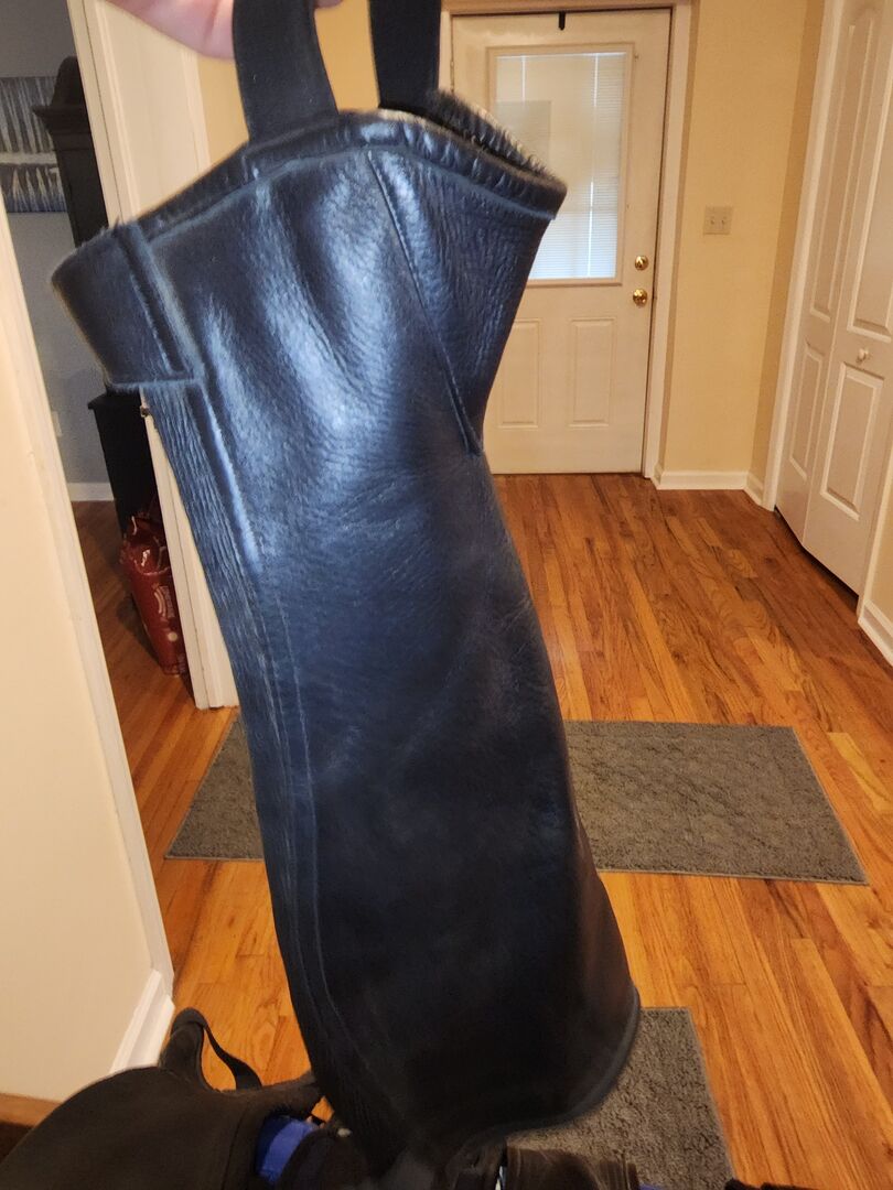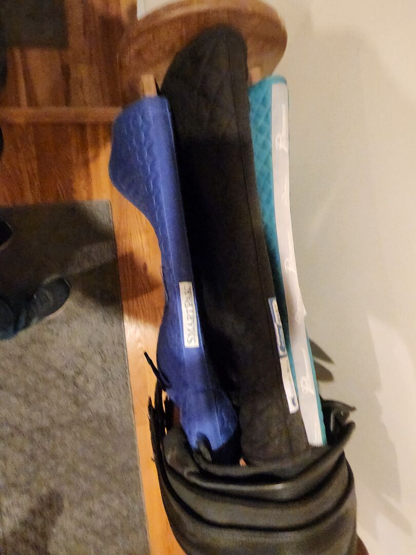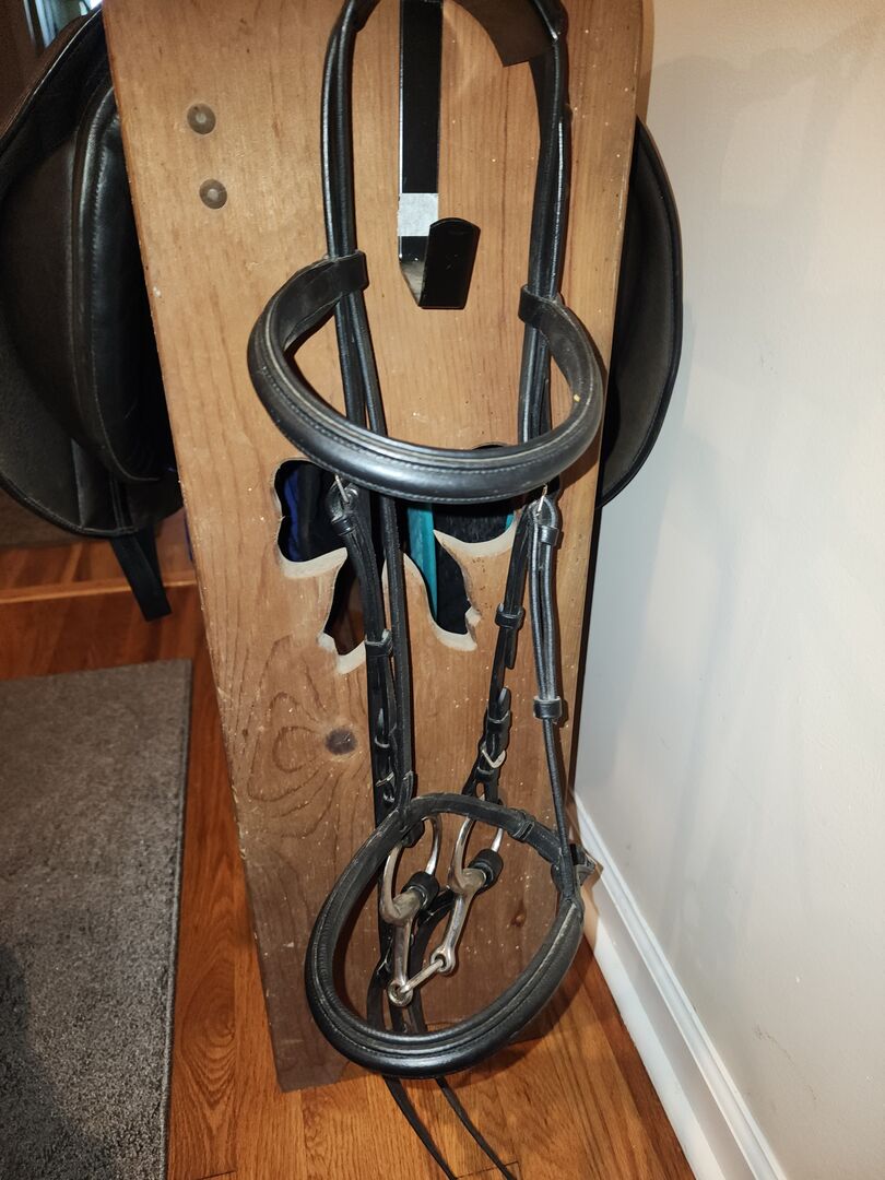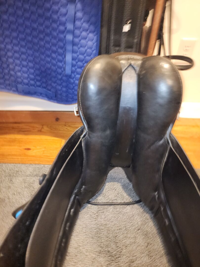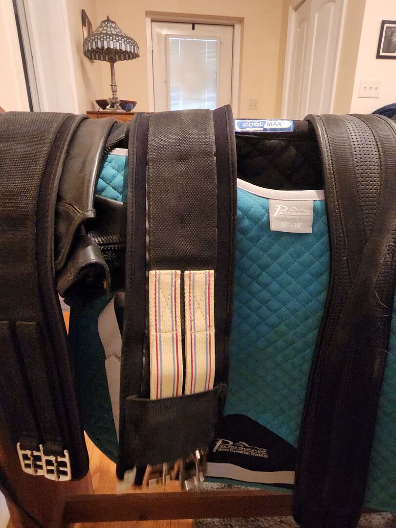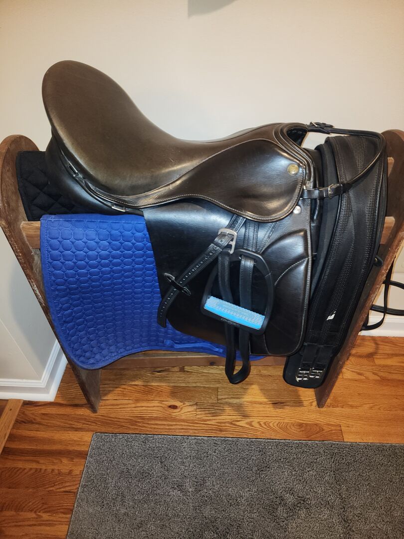 Great condition saddle , 18" wide angle. Leathers and composite stirrups included. Comes with 3 like new pads, 3 like new girths, large HDR bridle, with long leather rains, and and egg butt w / dog bone bit. Large ovation leather half chaps. Like new