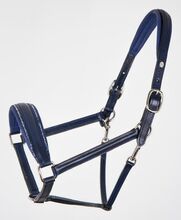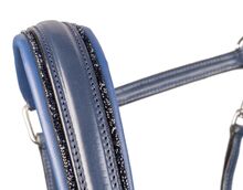 Niebieski luksusowy skórzany kantar z niebieską brokatową wstawką Fineline. Halter z zakładu rymarskiego O. Schumacher, wykonany z najwyższej jakości skóry i kryształów Swarovskiego.