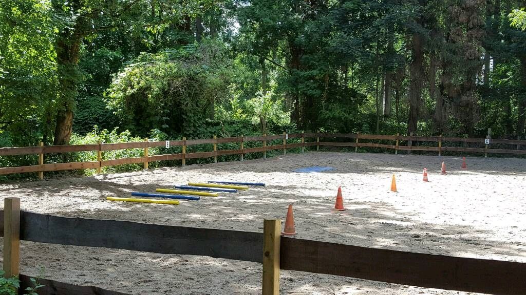 Otwarte stajnie / padoki Karmienie sianem 2x dziennie Wypas możliwy w lecie Arena jeździecka i okrągły kojec, oświetlone Boks awaryjny Miejsce do mycia Zamykane pomieszczenie na sprzęt Przytulna część wypoczynkowa i kuchnia Bieżąca woda (padok i pastwisko)
