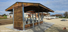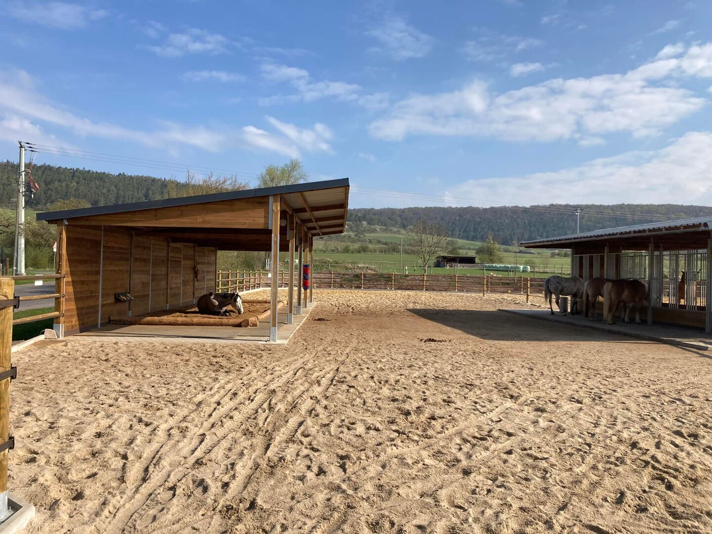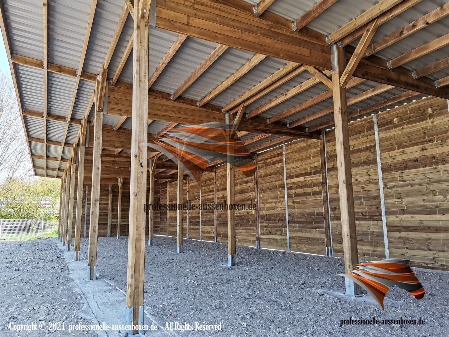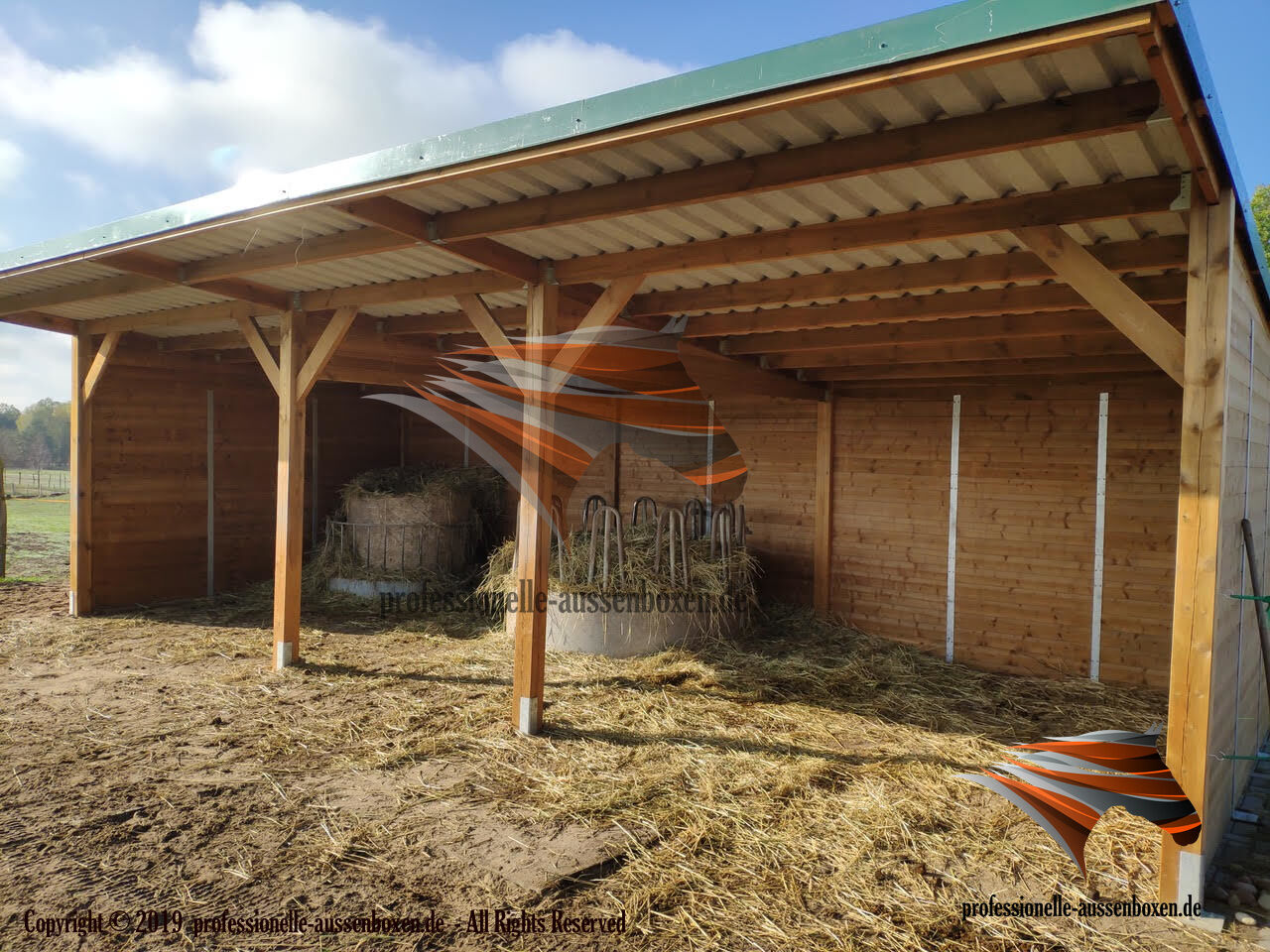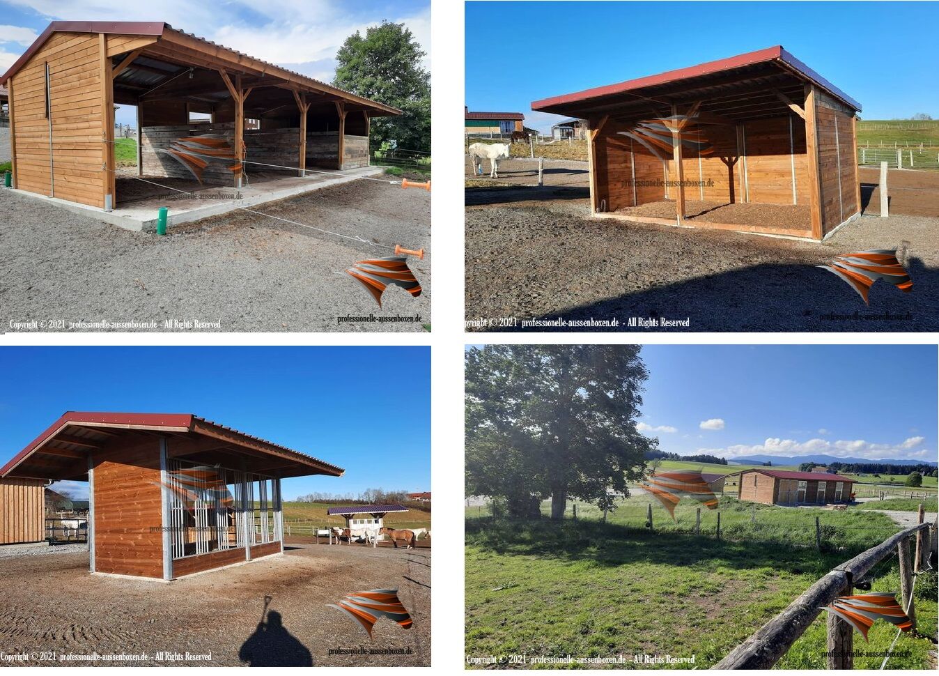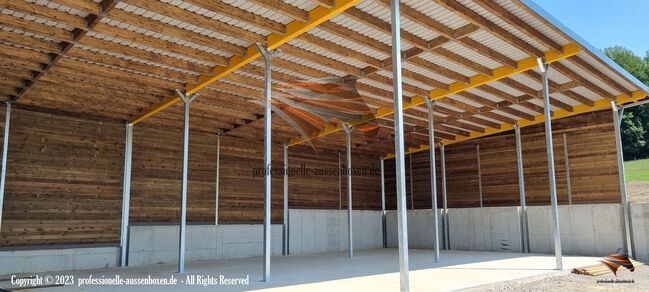 AUSSENBOXEN oferuje wysokiej jakości wiaty i zadaszenia dla koni, idealne na pastwiska, padoki i obszary karmienia.