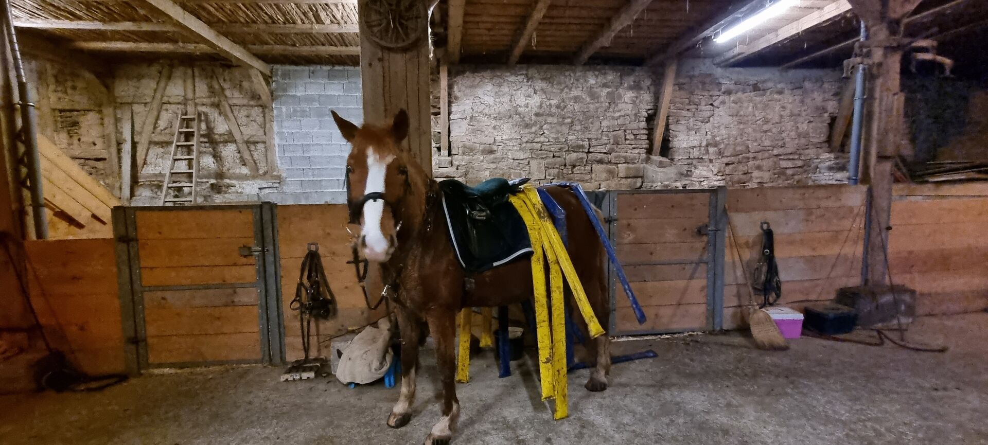 -Otwarta przestrzeń stajenna z regałem na siano i poidłem własnym