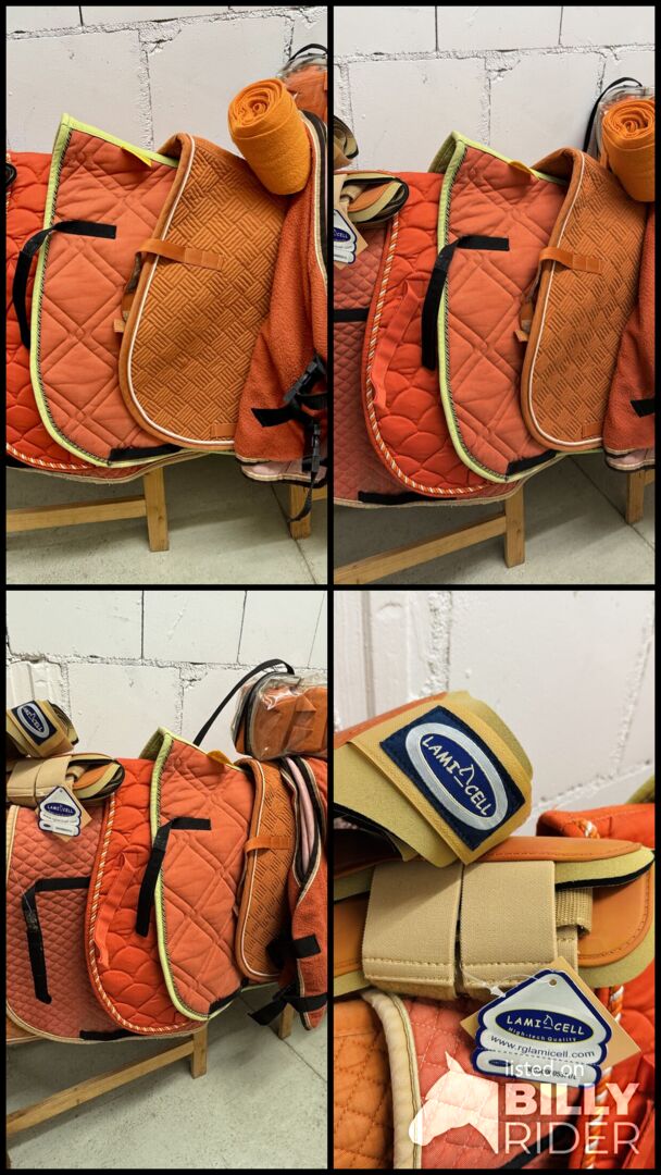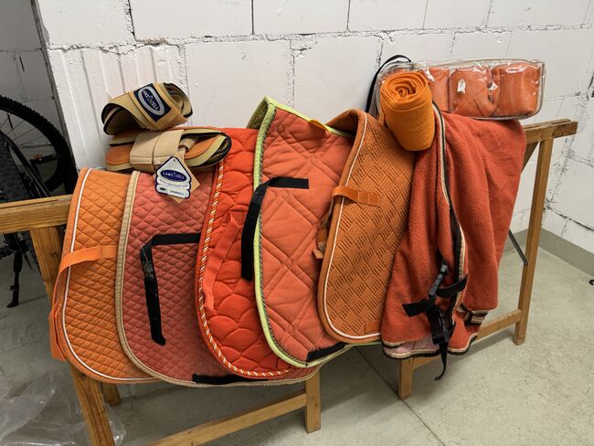 Zestaw zawiera: - Kilka podkładek pod siodło takich marek jak Eskadron, HKM i Kavalkade - 2 zupełnie nowe podkładki pod siodło - 1 zestaw zupełnie nowych, dopasowanych kolorystycznie podkładek pod ścięgna Lamicell (na przód i tył, WB) - Używana dopasowana derka przeciwpotna Eskadron 145 cm - Używane bandaże