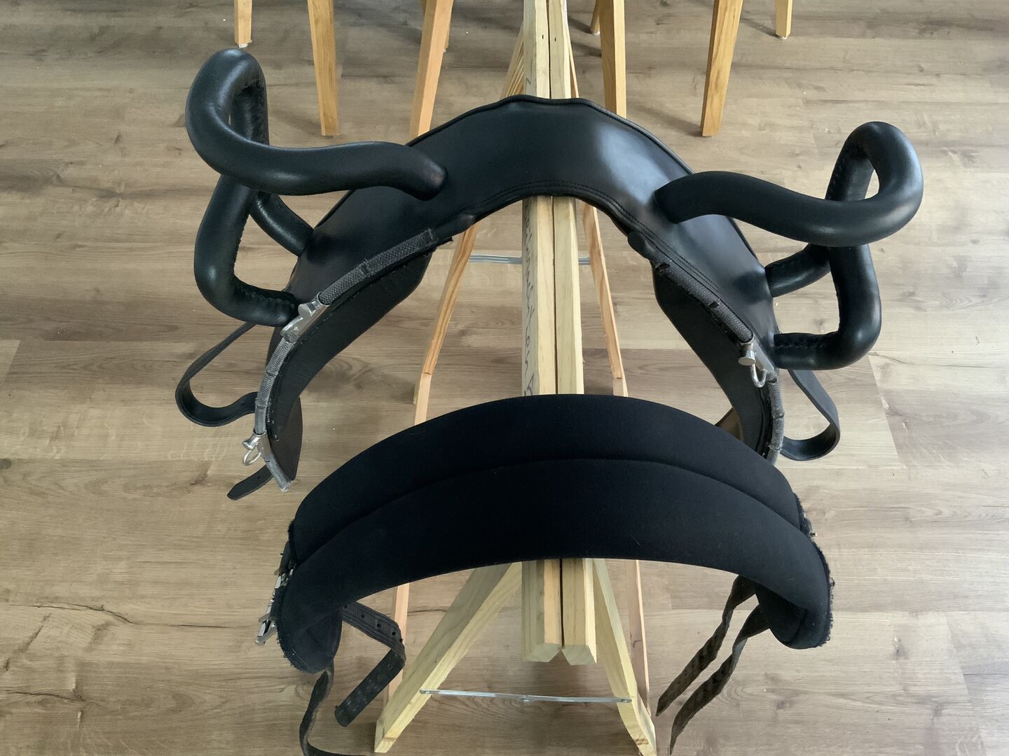 Pas do skoku w dal Kristina Boe - Uprząż do skoków z zakładu rymarskiego Meinecke - z kombinezonem rolkowym - z wymiennymi poduszkami - czarny - w tym dolny pas neoprenowy z długimi sznurkami, 65 cm - bardzo dobrze zachowana, prawie nie widać śladów użytkowania