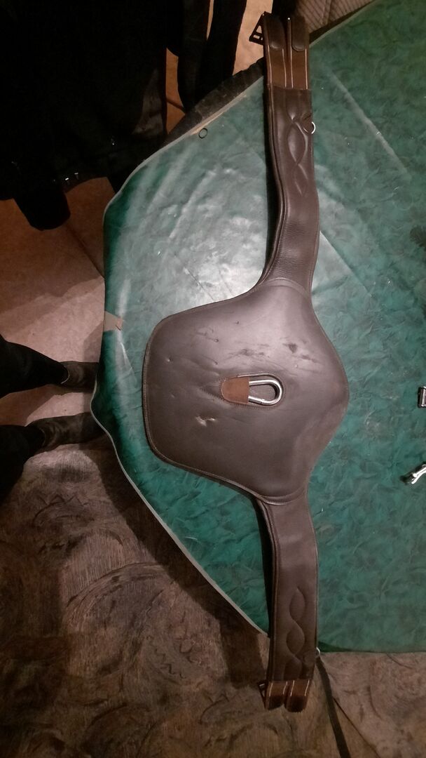 Pasek klinowy - Sprzedaję swój pas z ćwiekami, dobrze używany, skóra od wewnątrz straciła już trochę koloru. Jak widać na zdjęciu, również ze śladami użytkowania, jedno rozdarcie od knagi. Długość 140cm Brązowy, elastyczny po obu stronach i klamry rolkowe z karabińczykiem do napierśnika, inne Możliwy Paypal