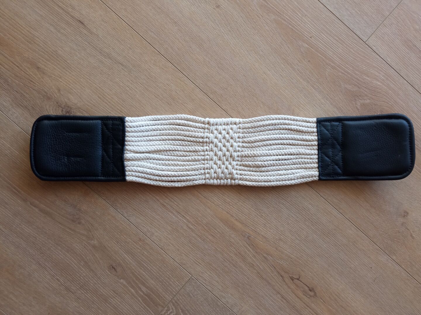 Pasek sznurkowy, bawełniany, krótki, 50 cm - Krótki popręg sznurkowy firmy Amka wykonany z bawełny, pleciony w środku, z D-ringiem i zabezpieczeniem sprzączki wykonanym z wysokiej jakości skóry. Kolor: naturalny/czarny !!! Długość: 60cm według producenta po rozciągnięciu. W leżącym, zrelaksowanym stanie 52,5 cm. Obwód jest jak nowy i był używany tylko raz. Pas został wyprany.