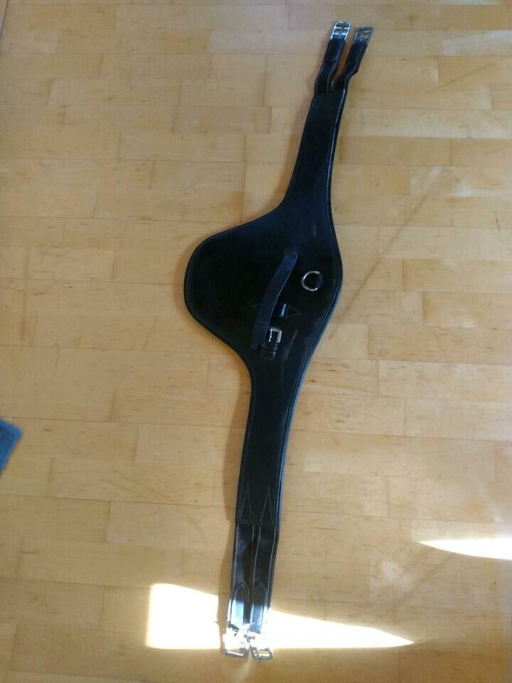 Pasek z ćwiekami 125 cm z gumką, czarny - Bardzo dobry stan, czarny pasek z ćwiekami o długości 125 cm, elastyczny po obu stronach. Bardzo dobrze utrzymane. Z pierścieniem w kształcie litery D i skórzaną pętlą do zapinania martingale & co. Brak uszkodzeń.