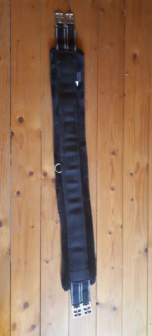 Pasy do siodła - Używany pas od Showmastera, 120cm, miękki pluszowy polar, elastyczne wstawki po obu stronach, rolowane sprzączki, D-ring pośrodku. (pas jest świeżo wyprany, ale w runie jest jeszcze trochę włosów, które niestety nie wychodzą)