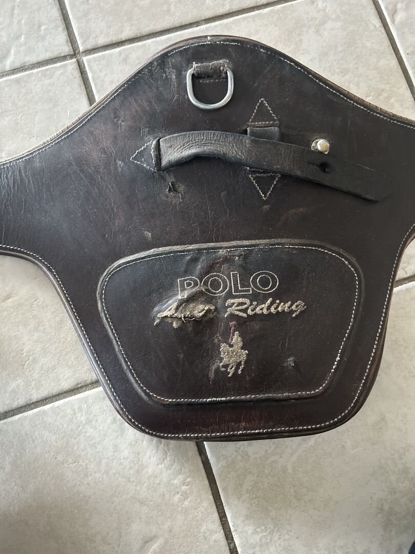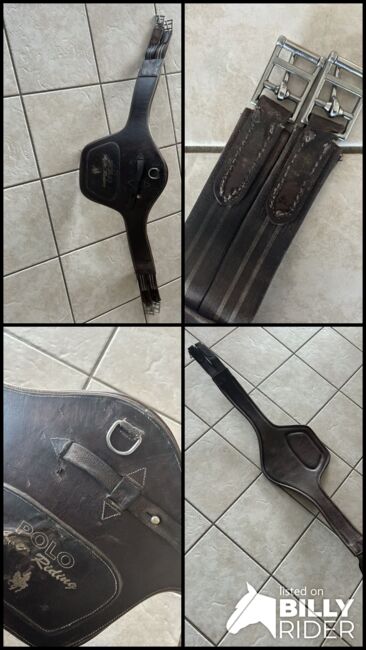 Pasy do siodła - Obwód skokowy na sprzedaż w długości 130 Niestety klapa na brzuchu jest nieco uszkodzona, co widać na zdjęciu, ale nadal zapewnia wystarczającą ochronę Ponadto skóra jest już nieco zużyta w jednym punkcie sprzączek (patrz zdjęcie), ale obecnie nie ogranicza to funkcji popręgu.