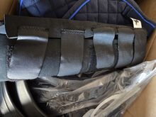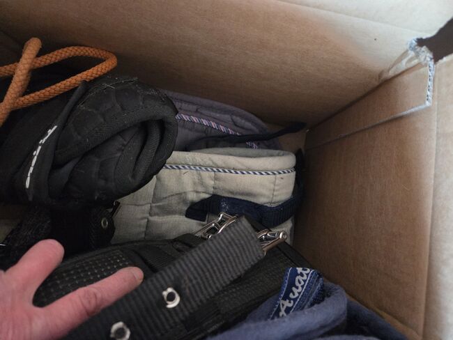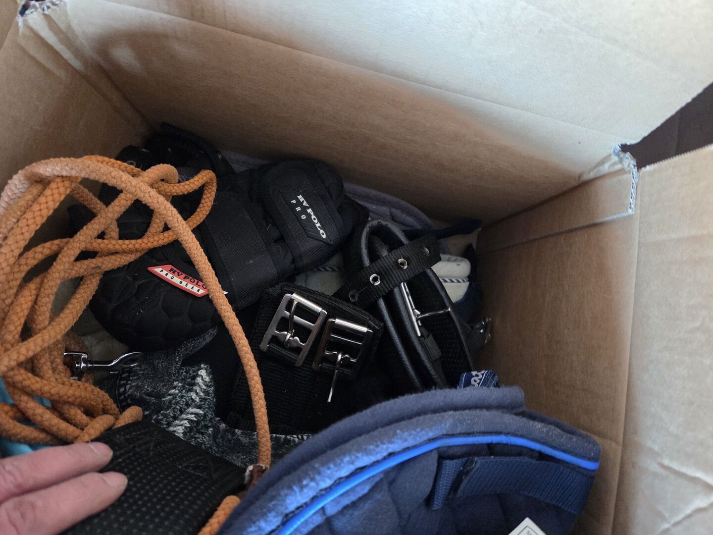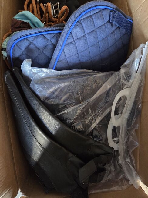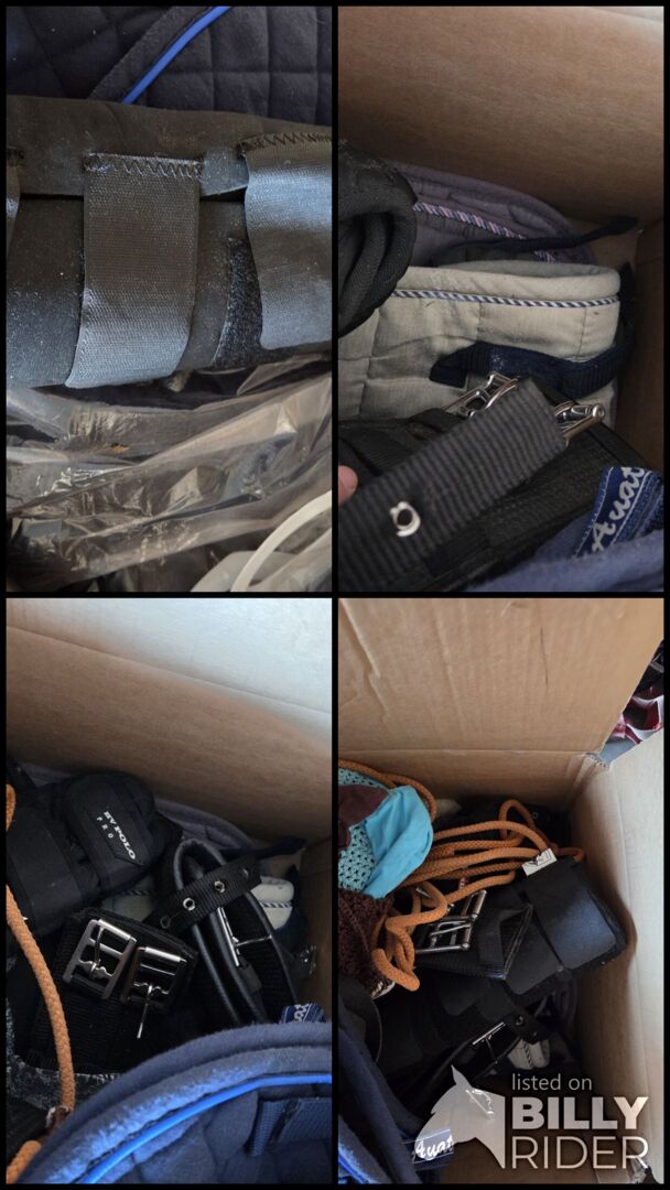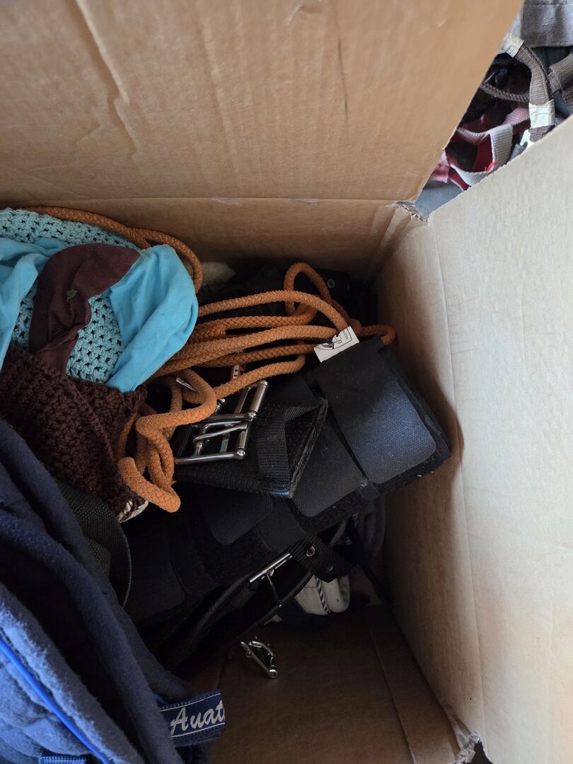 Pasza dla koni 1 pełne pudełko - Pudełko zawiera getry, popręg siodłowy długi i krótki, linkę do lonżowania, derki pod siodło, muchy w różnych kolorach, 1 smycz dla psa + 1 × czapsy w kolorze czarnym.