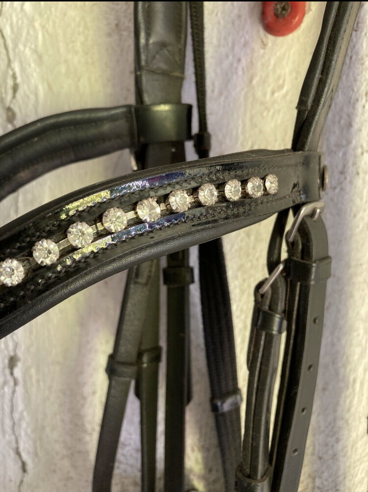 Patentowy snaffle - Czarny patentowy snaffle z pięknym paskiem na czoło, grubo wyściełany, szwedzki nosek