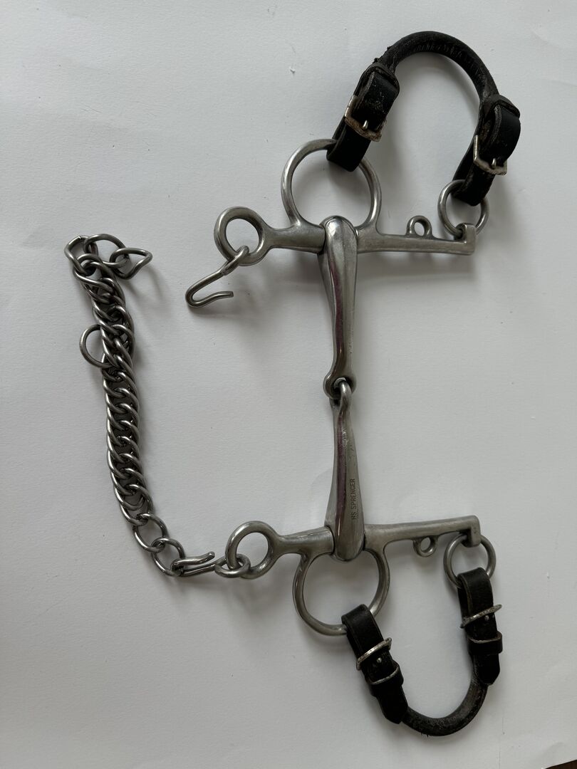 Pelham HS Sprenger pojedynczy złamany 14,5 cm - Pelham od HS Sprenger z łańcuchem kink. Bit jest jak nowy. Skórzane paski stały się trochę twarde, ponieważ leżały w mojej szafie przez kilka lat.