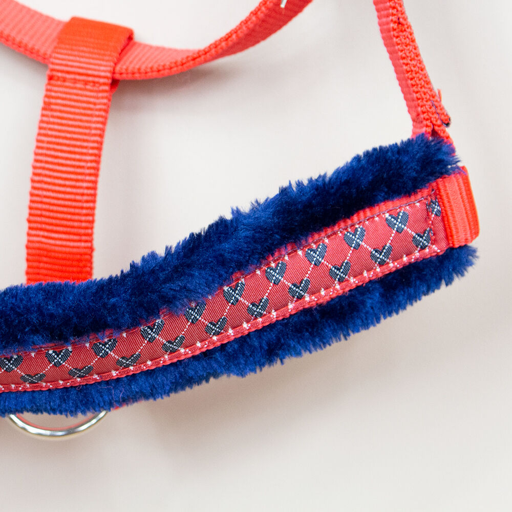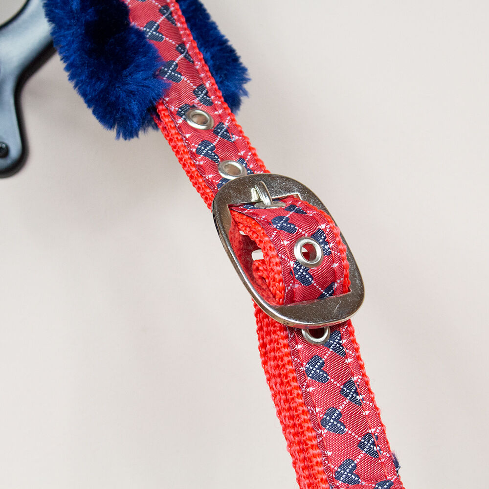 PFIFF Halter z syntetycznym futrem Neapol czerwony/niebieski FULL - Ten piękny halter od PFIFF jest idealnym towarzyszem na co dzień. Doskonale sprawdza się jako halter stajenny lub transportowy. Posiada regulację na karku, dzięki czemu pasuje na wiele różnych koni i kucyków. Jest to rozmiar FULL. Posiada miękką podszewkę i piękny wzór w serduszka. Miękkie futerko w świetnym kontrastowym kolorze to kolejny punkt komfortu. Halter jest nowy z metką. To the seller's offerlaunch